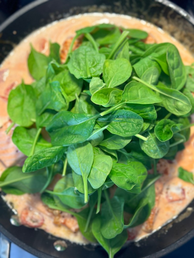 Fjern skindet fra laksen og hver stykke skæres ud i 3 bidder. Disse krydres med salt og pber og steges i smør på en varm pande. Så snar de har fået lidt stege skorpe, sænkes varmen og hvidløg, tomatpure, og cherry tomater (halveret) kommer med på panden. Tilsæt fløden, og endelig tilsættes fløden og 2 store håndfuld spinat kommer på toppen. Lad retten klare sig selv i nogle minutter og til spinaten er blevet både mindre og tilberedt. Smag til.