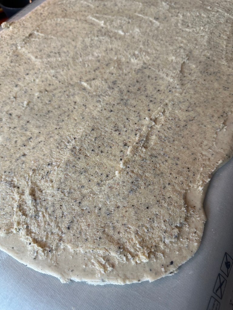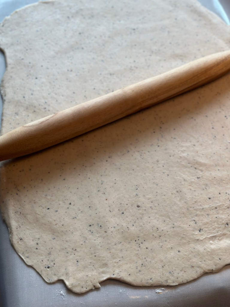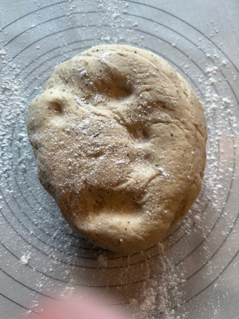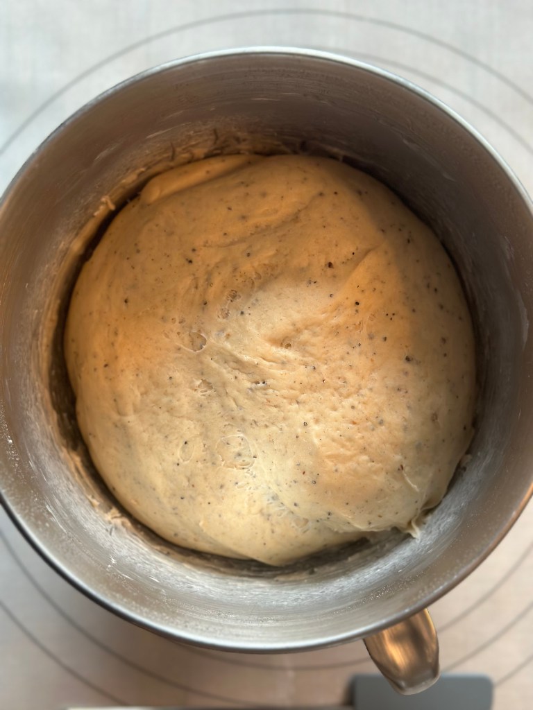 Dejen skal være hel glat og spændstig. Sæt den på køl til koldhævning natten over. Den kan også bare hæve lunt i 2 timer, men jeg foretrækker koldhævningen, da dejen bliber nemmere at arbejde med.