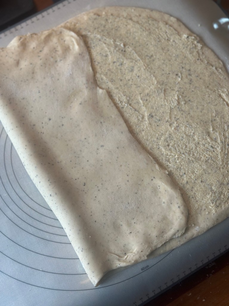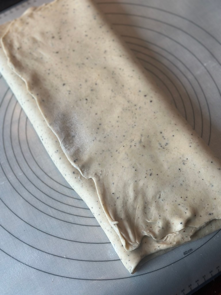 Rul dejen ud til ca. 40 x 30 cm. Smør remoncen jævnt ud. Og så kommer noget vigtigt. Fold 1/3 over en 1/3 af dejen. Fold den sidste 1/3 over de nu 2/3 som ligger over hinanden. Det resulterer i, at remoncen nu ligger i 2 lag.