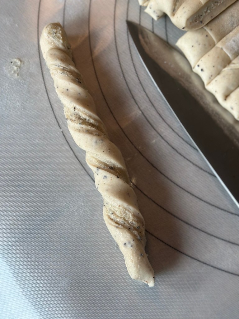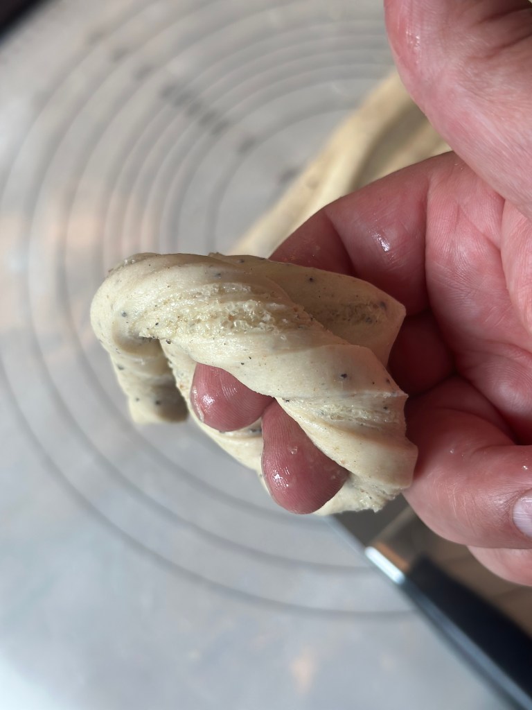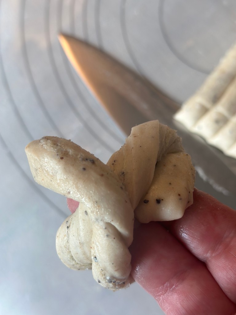 Skær på tværs i ca 1,5 cm tykke strimler. Tvist strimlerne, mens du trækker lidt i dejen. Rul rundt om 2 fingre, og tvist enden igennem hullet som fingrene har skabt. Se billedet.