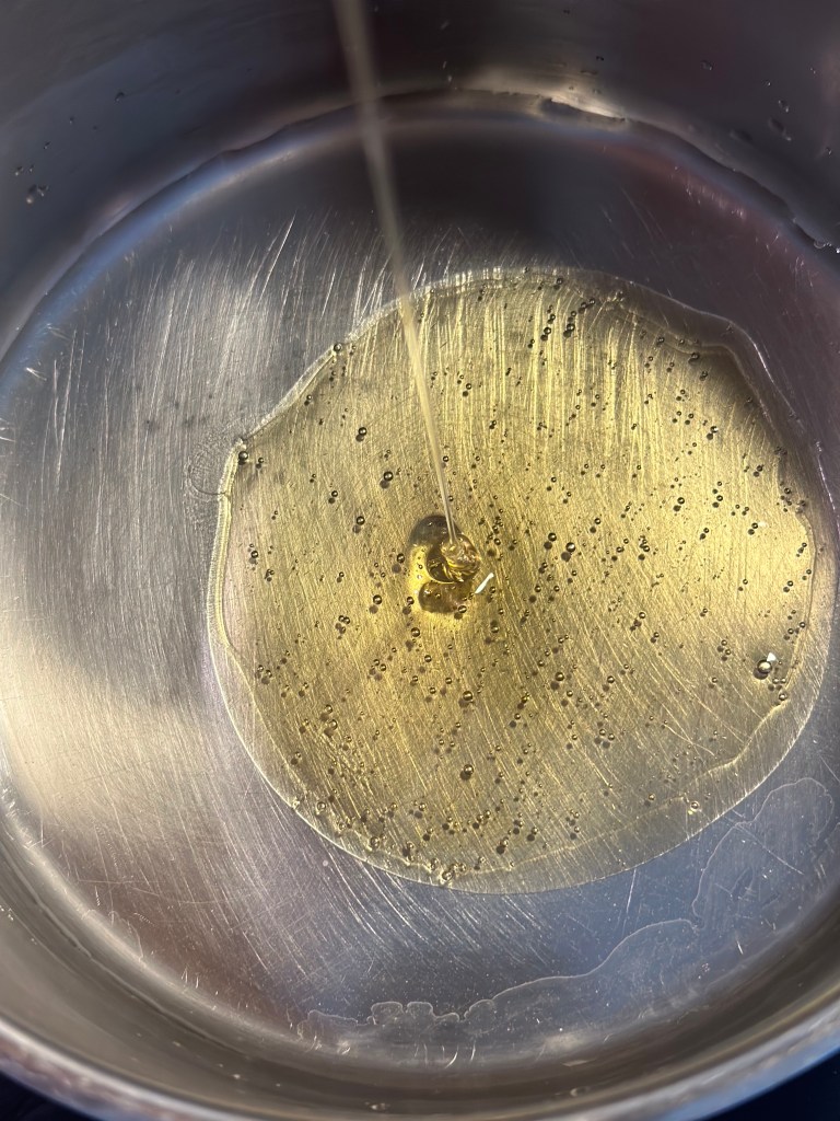 Mens de er i ovnen, koger man vandet op sammen med honningen – det skal boble lidt sammen.
