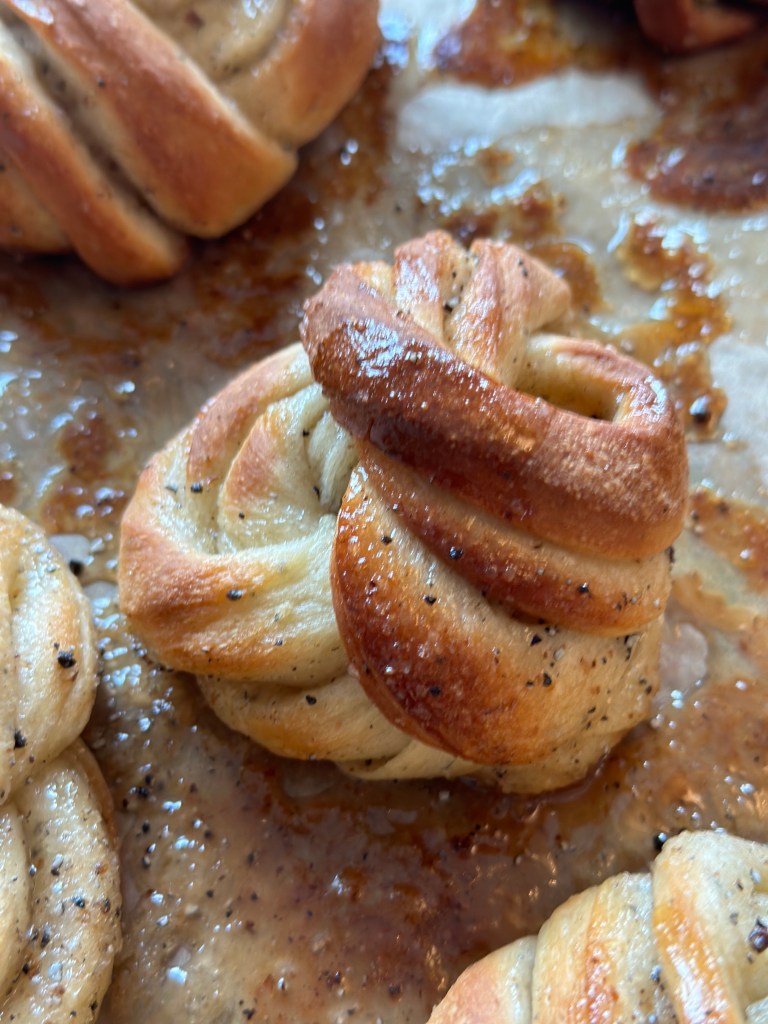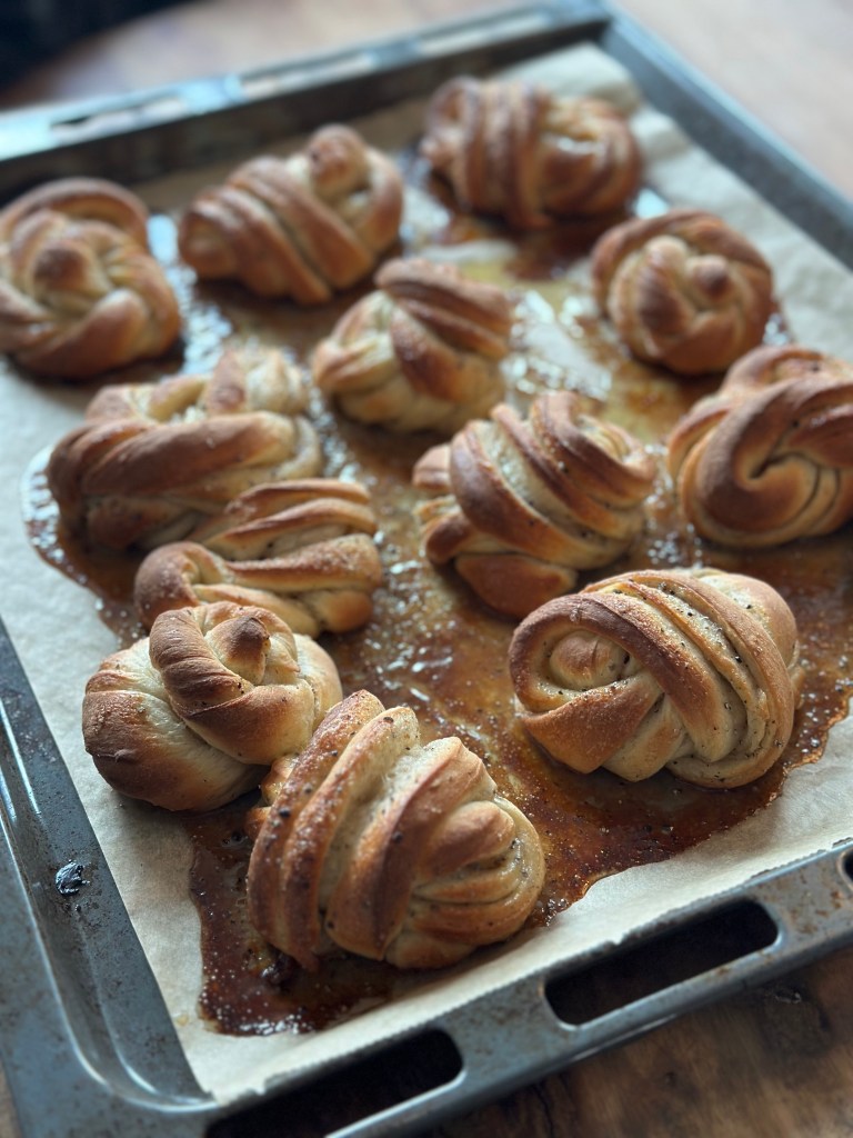 Straks som kardemommesnurrene komme ud af ovnen, pensler man med glacen, så de bliver blanke på toppen.