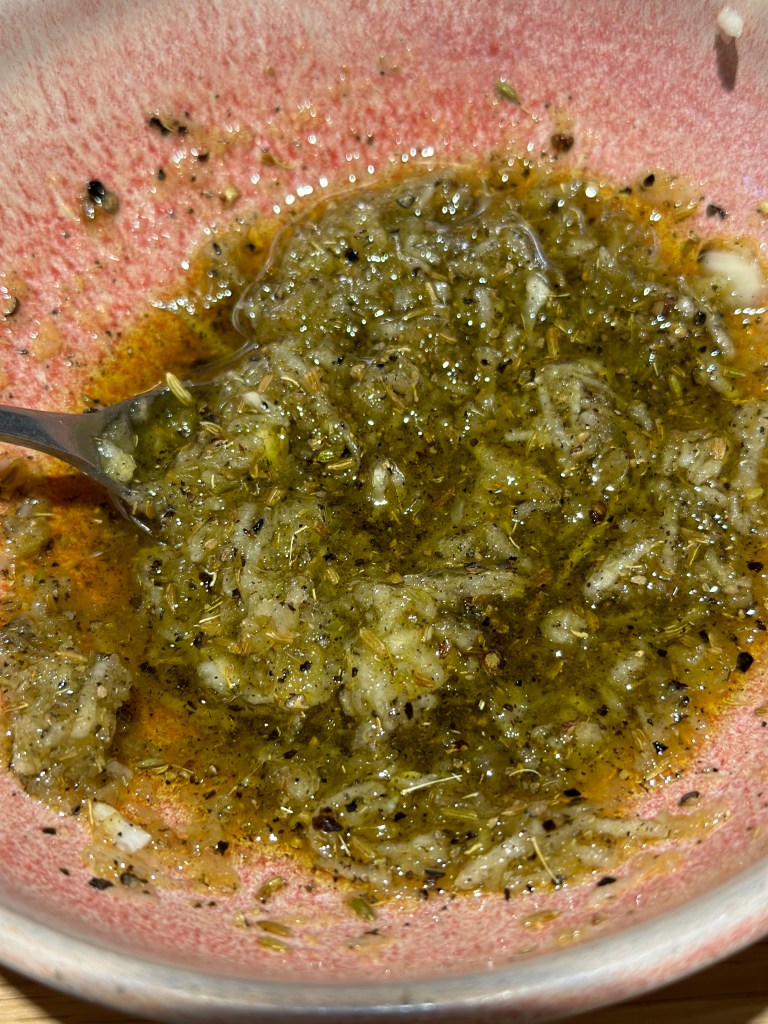 I princippet kan du bare blande Marinaden og krydderurterne, og jeg ved ikke hvorfor metoden er, at man først lægger et lag marinade og derefter et lag krydderurter, men det er sådan man skal gøre det “Italian style”.
