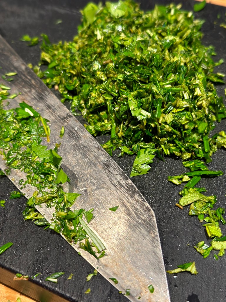 Frisk fra haven. Vaskes godt, og hakkes fint.