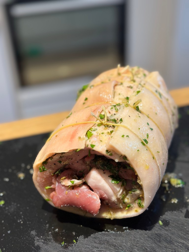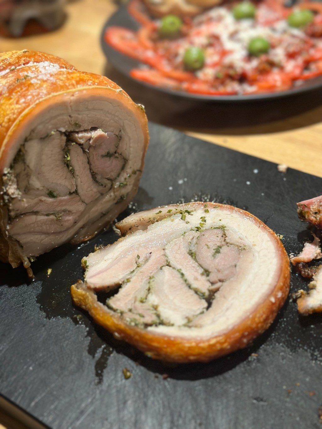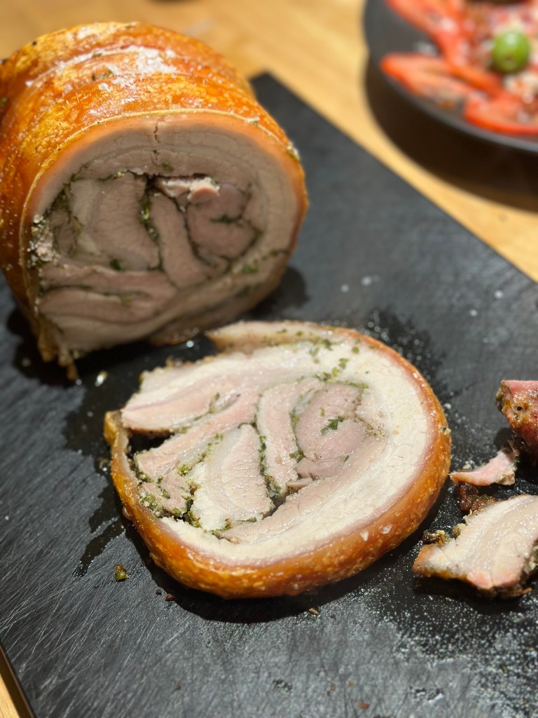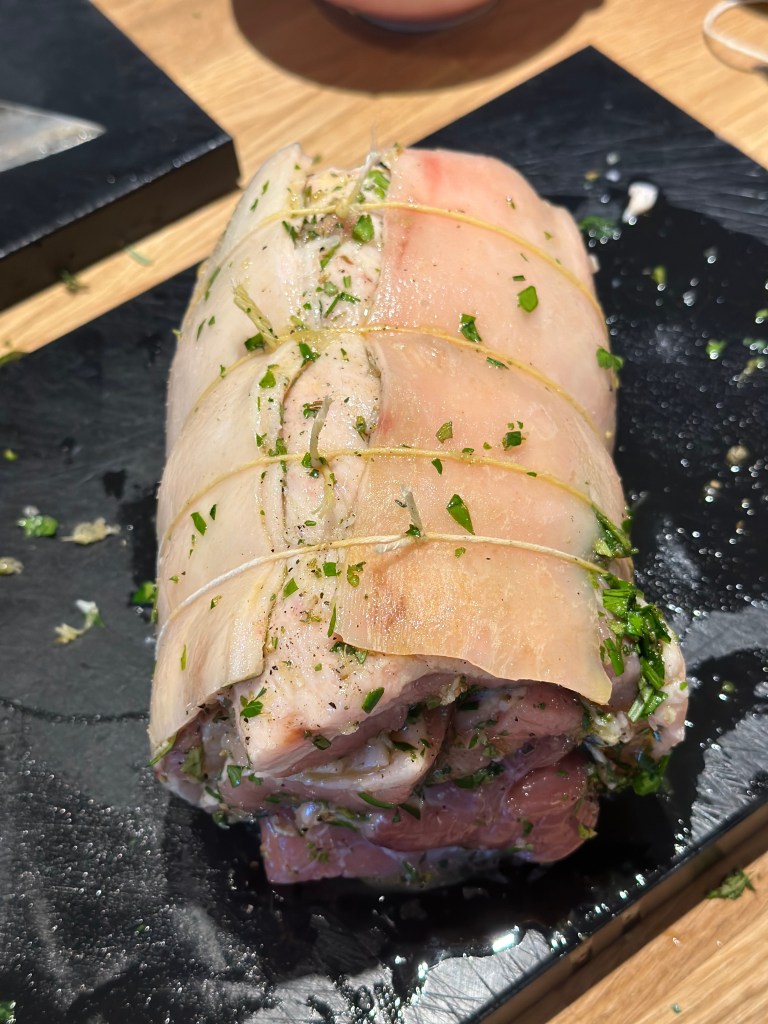 Jeg har lavet Porchetta før, men ofte har jeg købt den færdig – og gerne med lam. Men jeg blev præsenteret for en original måde, at folde den på – hvor man i slaget laver 2 snit i hver side – hver sin vej, og folder henover hinanden for til sidst at samle den. Det synes jeg lød så spændende, at det skulle prøves. Og det virker for vildt.