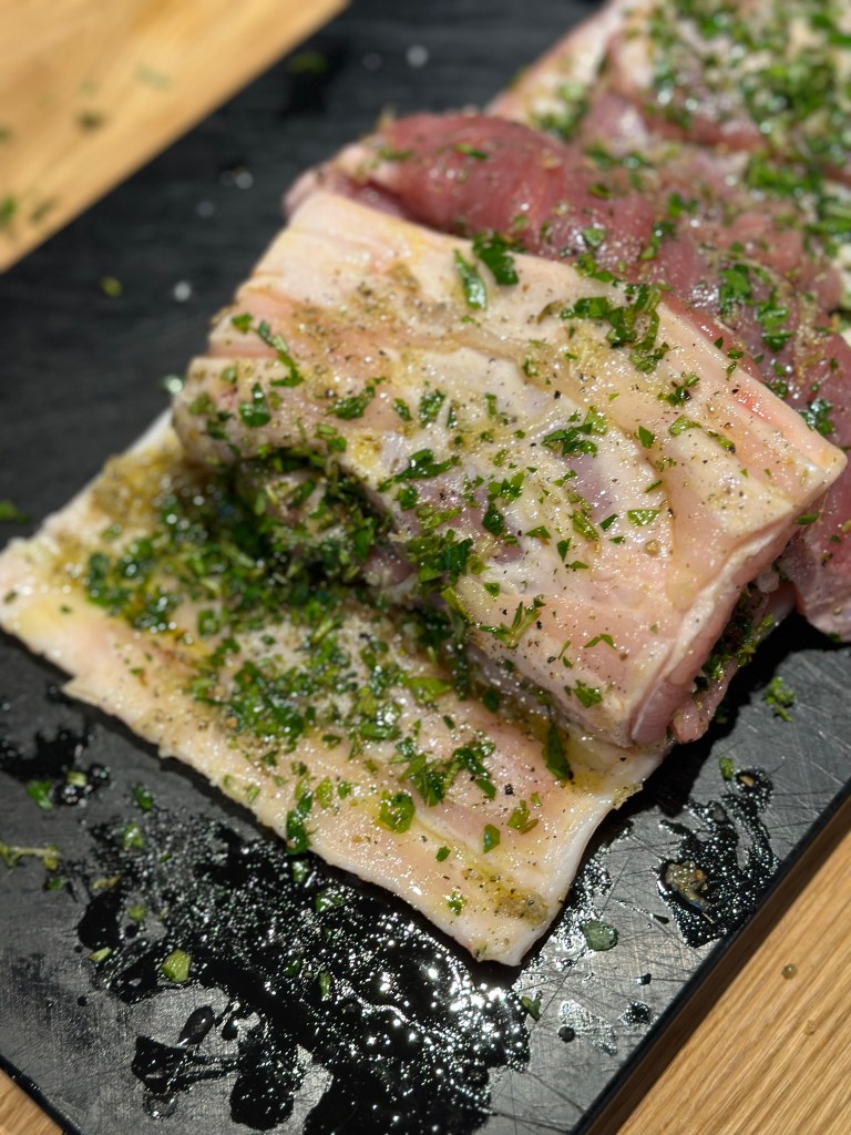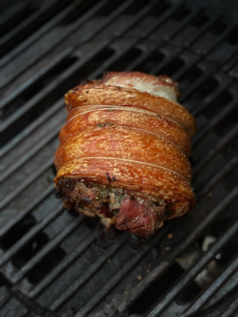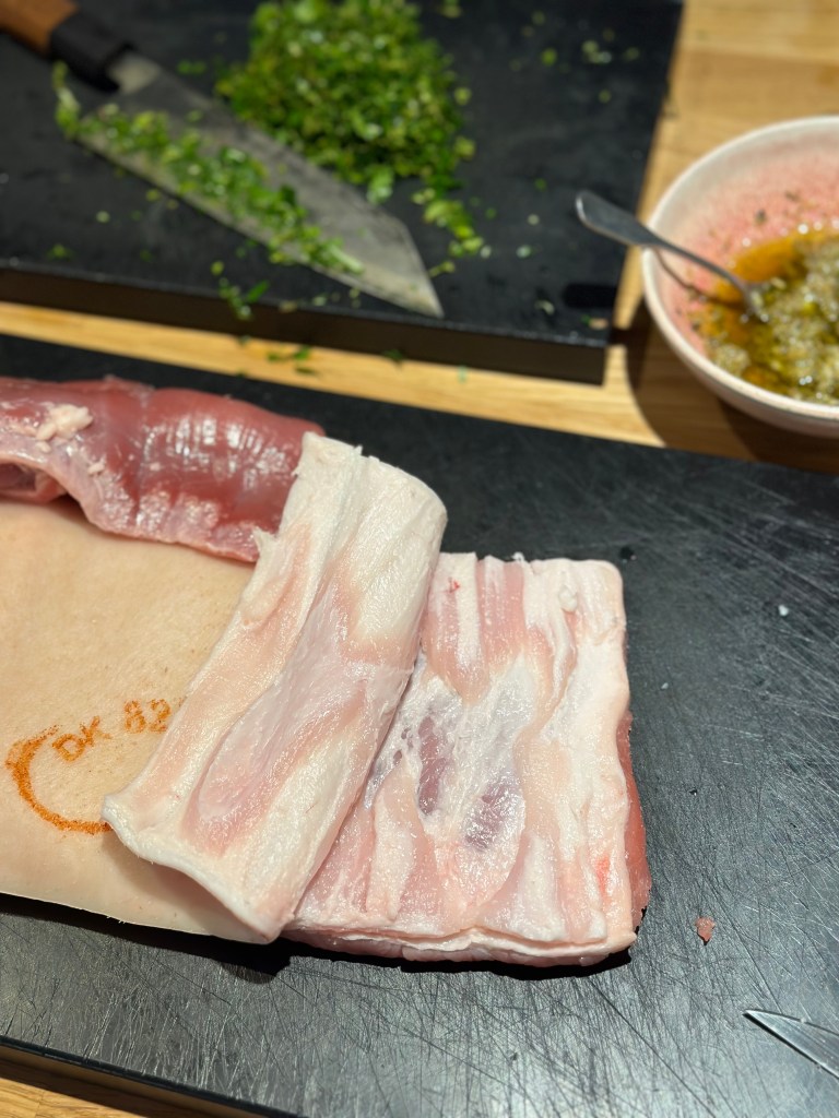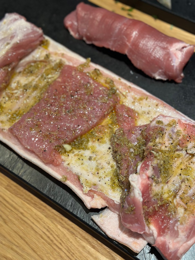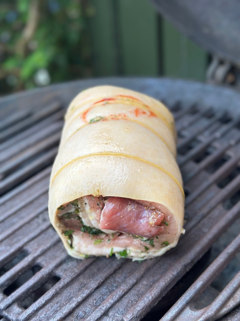 Jeg har lavet Porchetta før, men ofte har jeg købt den færdig – og gerne med lam. Men jeg blev præsenteret for en original måde, at folde den på – hvor man i slaget laver 2 snit i hver side – hver sin vej, og folder henover hinanden for til sidst at samle den. Det synes jeg lød så spændende, at det skulle prøves. Og det virker for vildt.