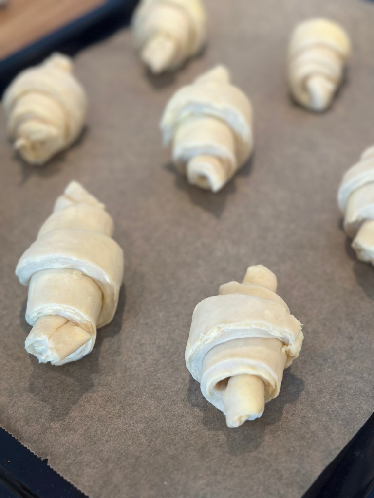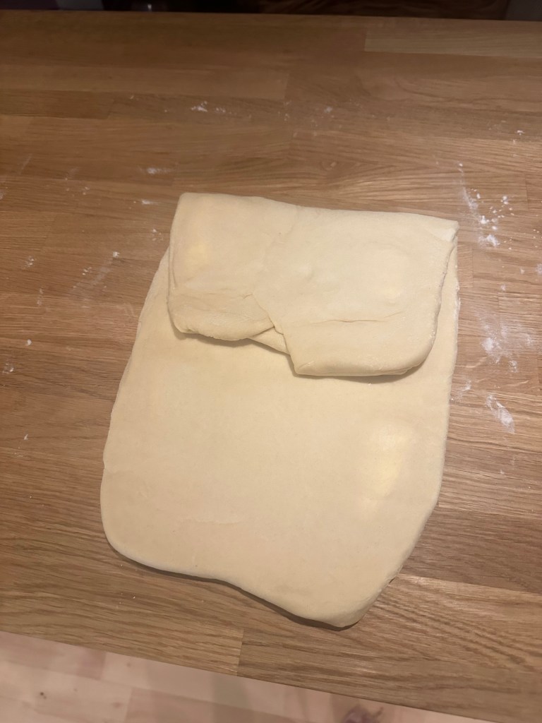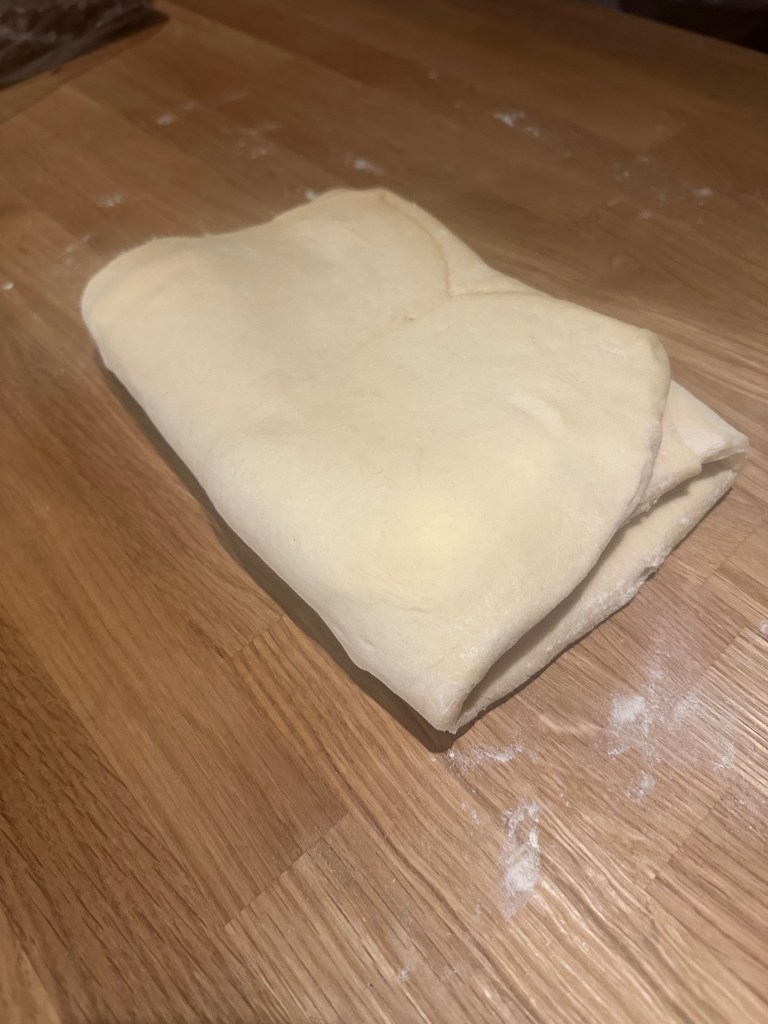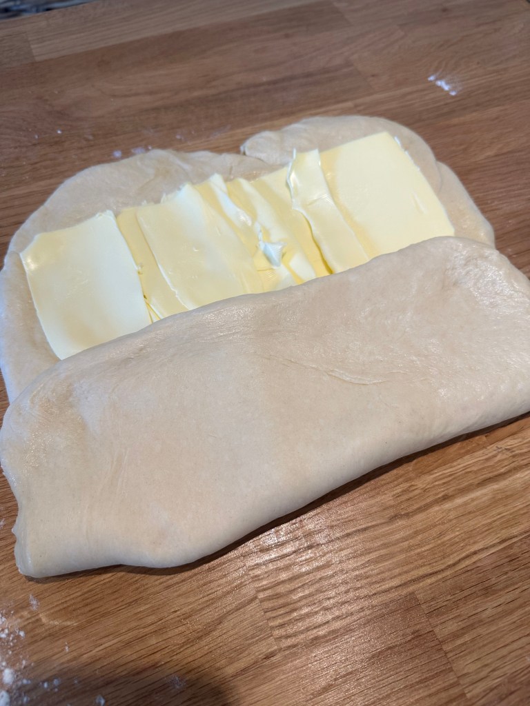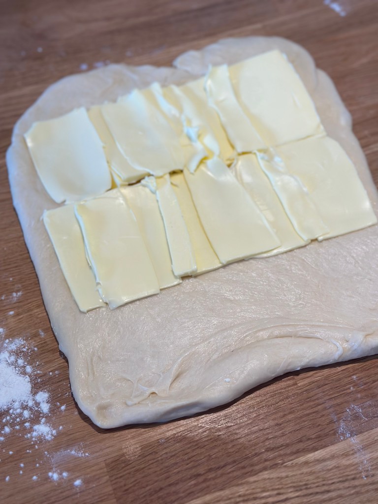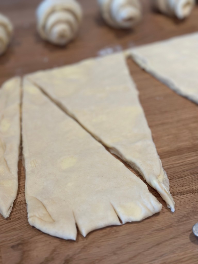 De fleste opskrifter inkluderer cm mål, men du kan sagtens gøre det “på slum”. Men kvaliteten i croissanten kommer af antallet af lag, og den skal der være 27 af. Typisk folder man 3 gange – og det gør man 9 gange. I mellem hvert “sæt” kommer du dejen på køl, men du kan sagtens “spare” et sæt eller to, ved at folde 2 eller 3 gange pr “sæt”.