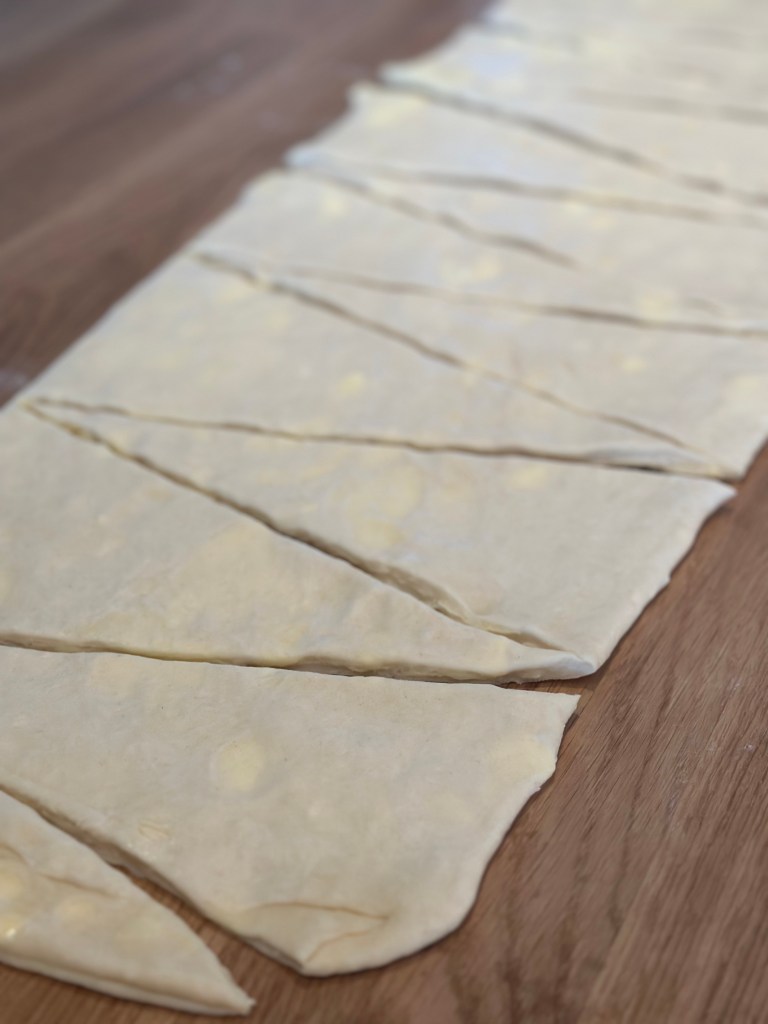 Ruller den herefter ud med ca. 15 cm i bredden og skærer i trekanter. Hver trekant giver du to snit på det brede stykke, og når du ruller dejen, trækker du i hjørnerne, sålede den bliver “bredere”.