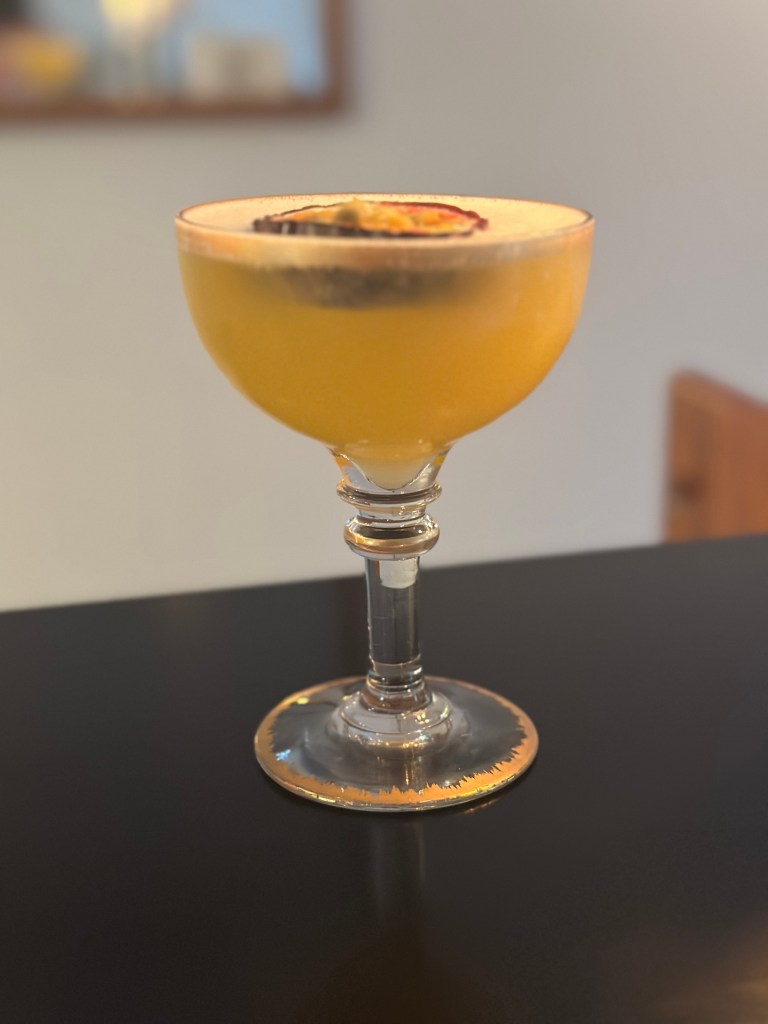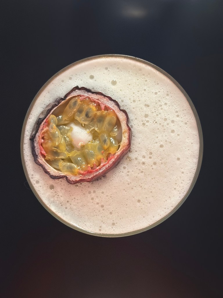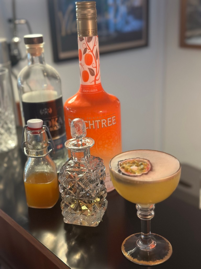 Jeg har lavet min egen version, hvor jeg har udskiftet passionsfrugt likør med fersken likør, og tilsat æggehvide. Så ligger passionsfrugtskiven bedre.