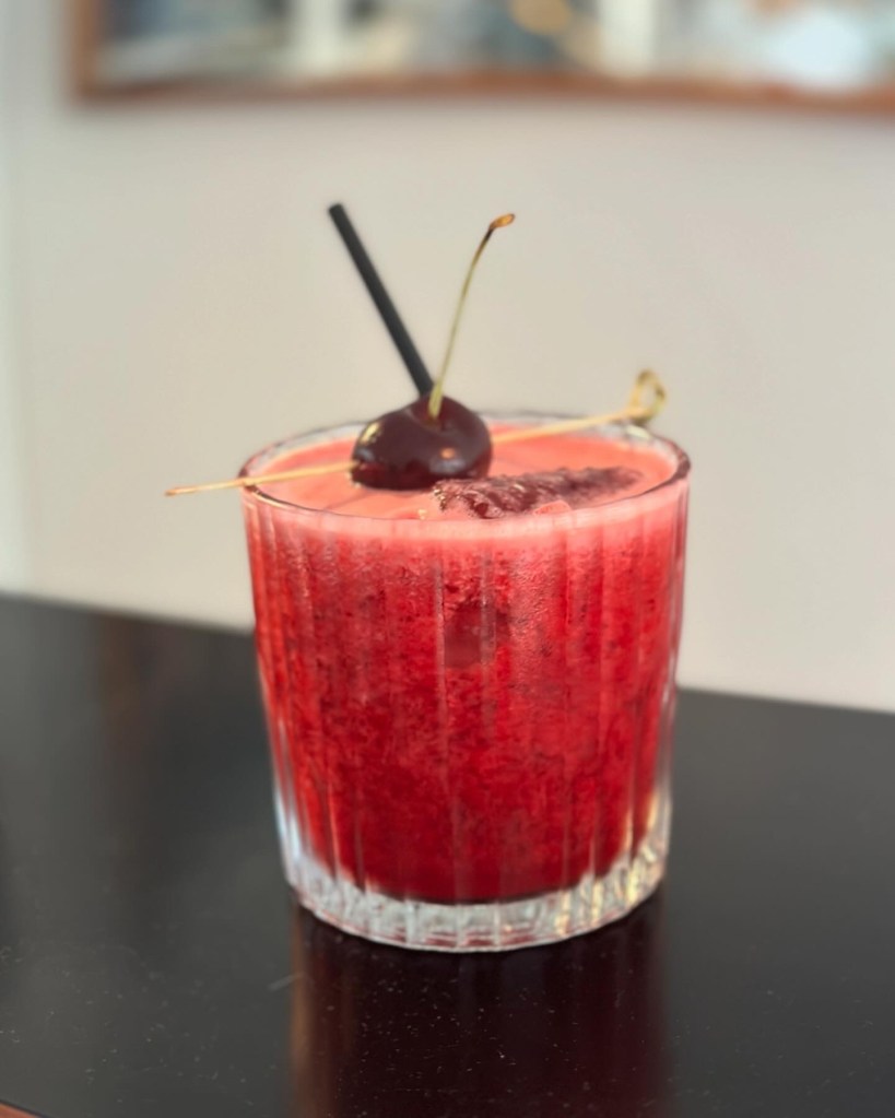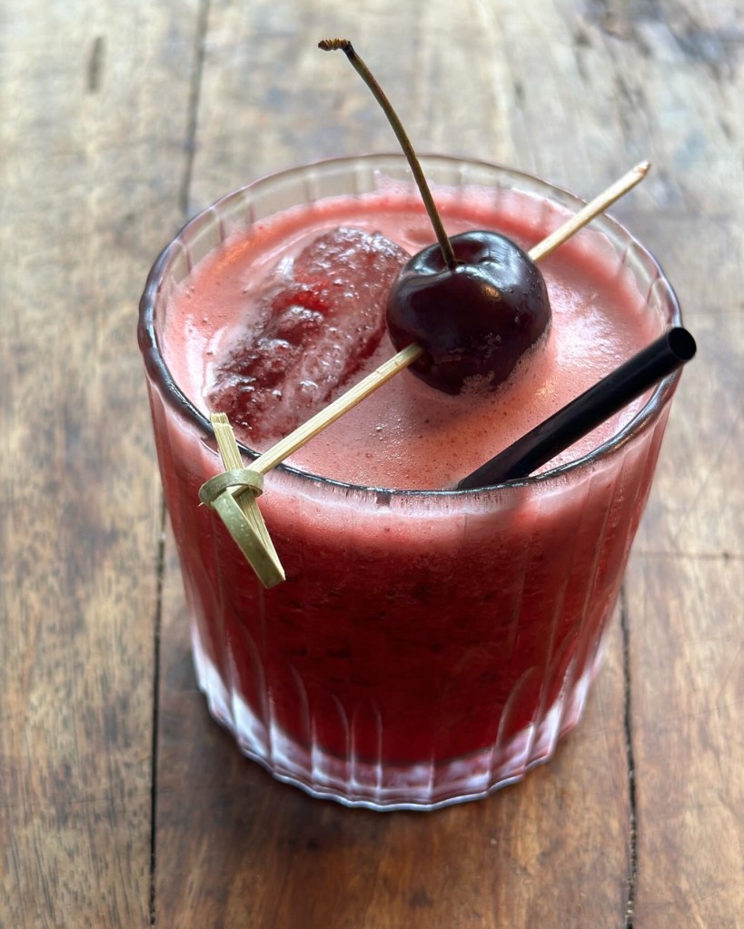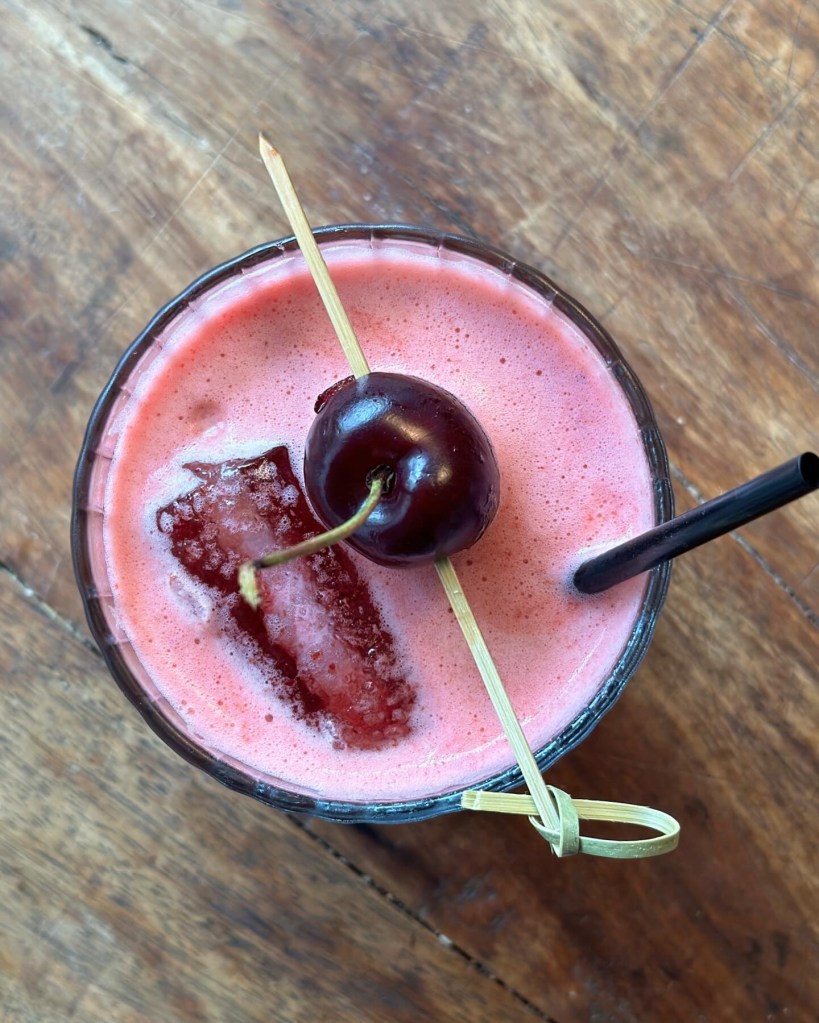 Jeg blender kirsebær, lime og et par isklumper. Man kunne godt si den, men den er faktisk rigtig lækker med de hele blendede bær – og så får du også antioxidanterne fra skallen. Tilsætter gin og rør drinken. Tilsæt et par isklumper mere, og server med et helt kirsebær.