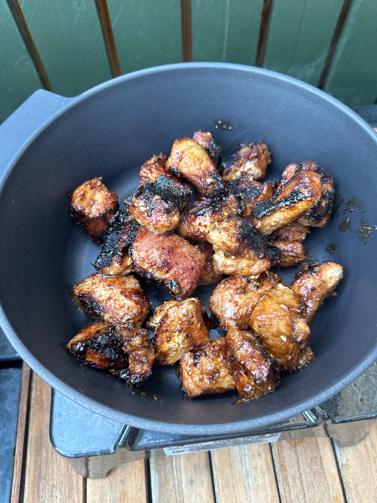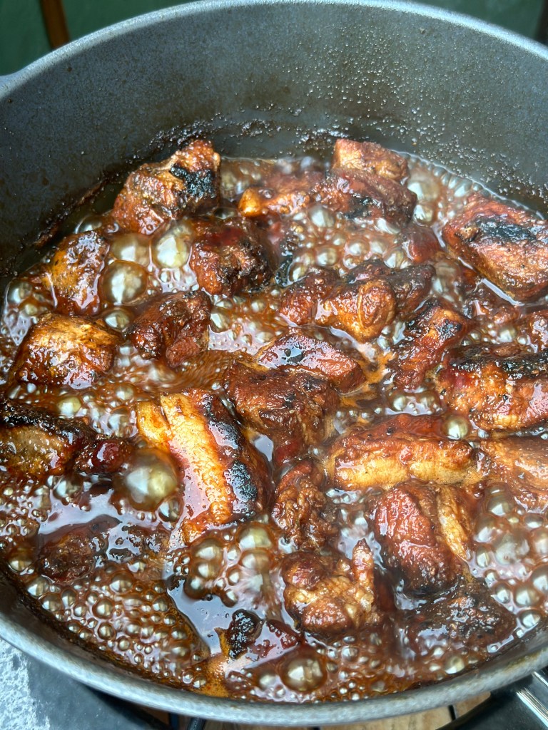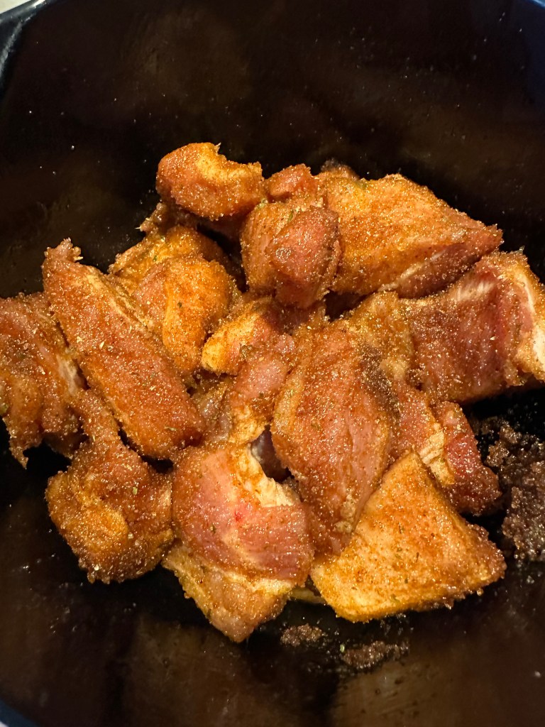 En populær grill ting for tiden, hvor det er bryststykket fra grisen som skæres i store tern. Først får det en rub at krydderier og brun farin, og derefter steges i en gryde sammen med en væde – og her bruger jeg to Dr. Pepper, men du kan bruge cola, øl, vin eller fond.