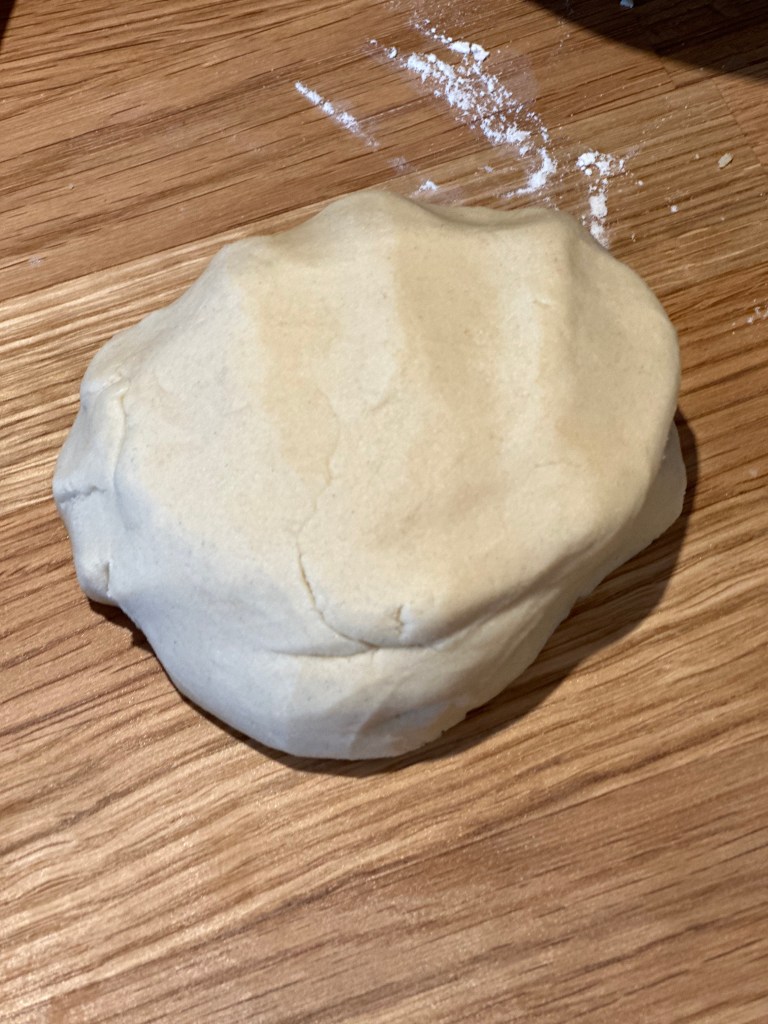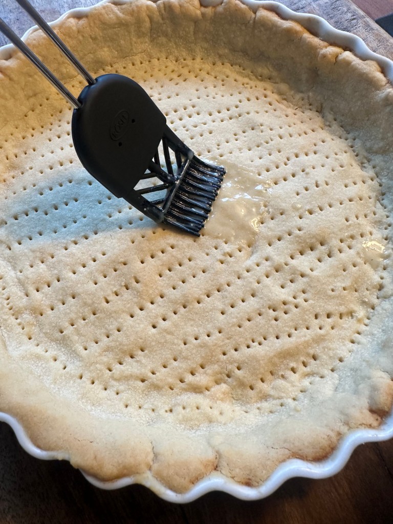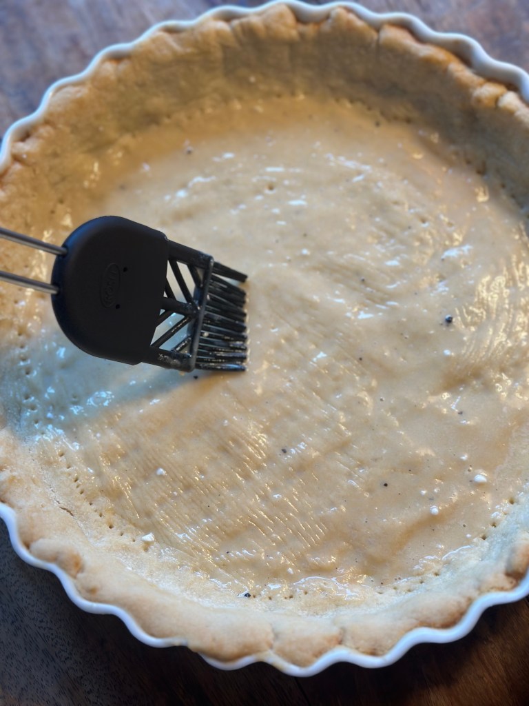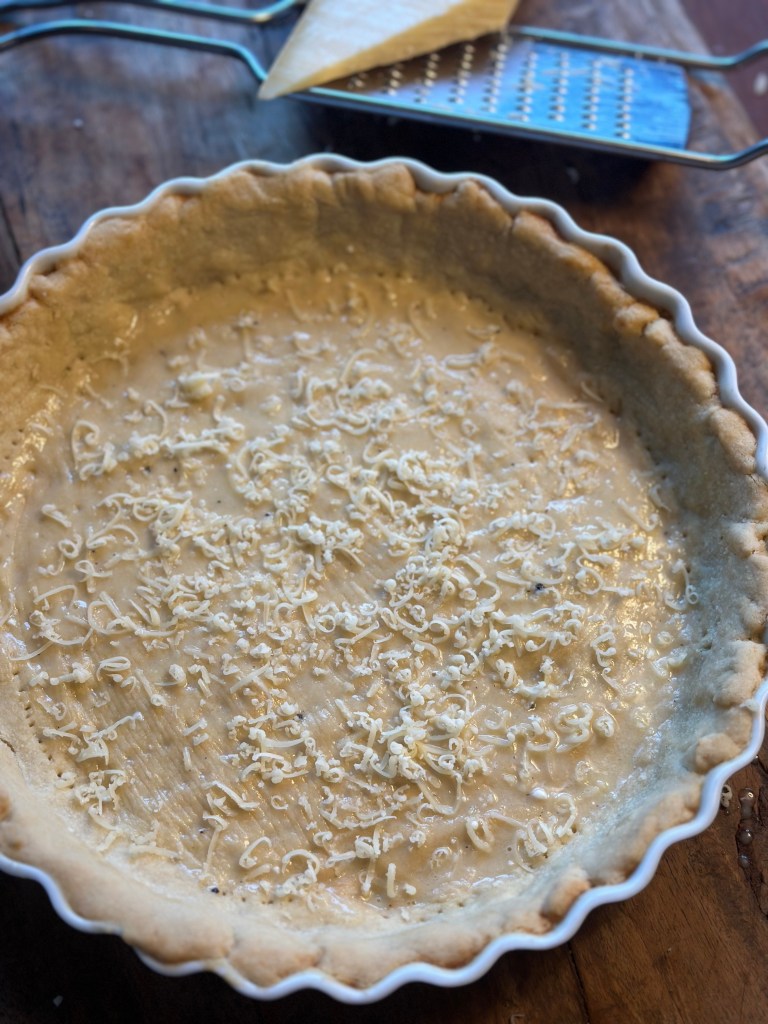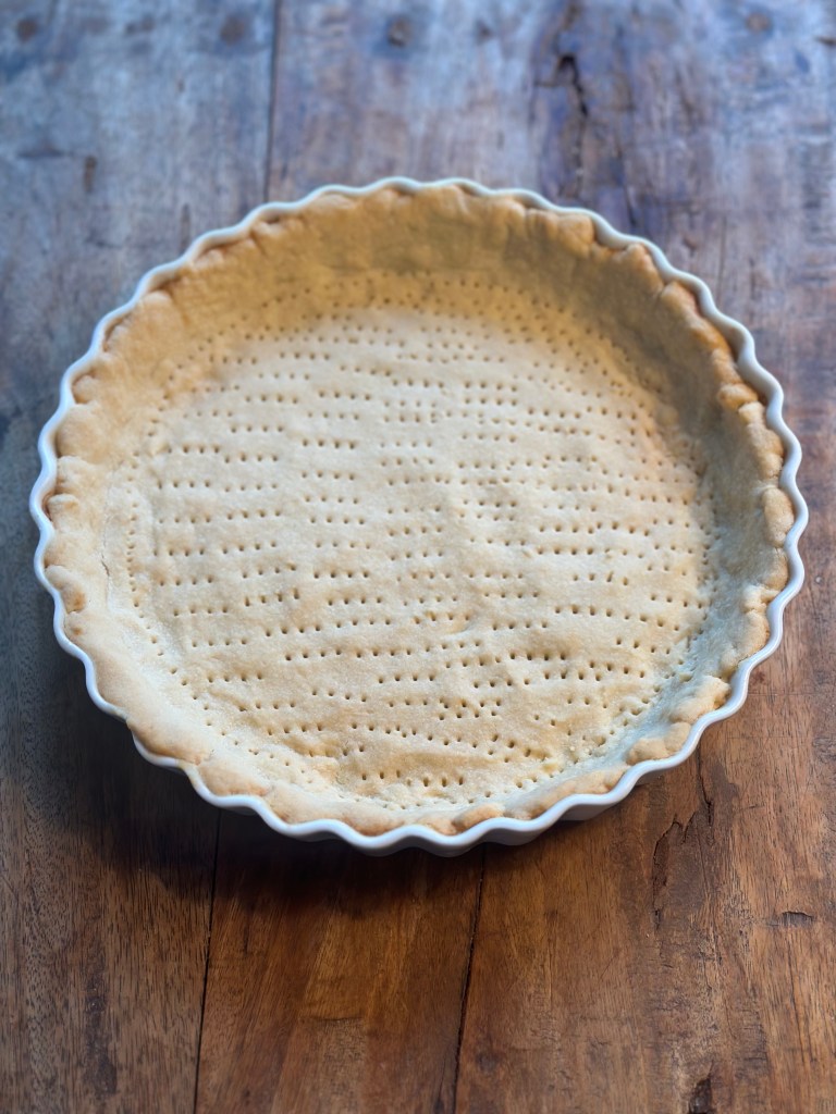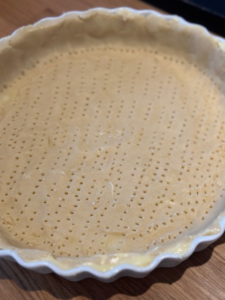 Hvedemel, salt og koldt smør – røres sammen. Resten tilsættes og dejen samles. Monter i en tærteform – jeg ruller den ikke ud, men trækker den stille og roligt i en smurt form.