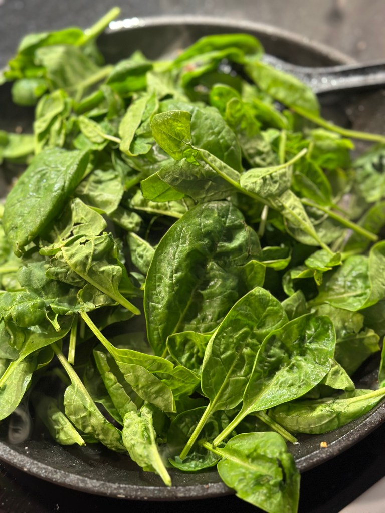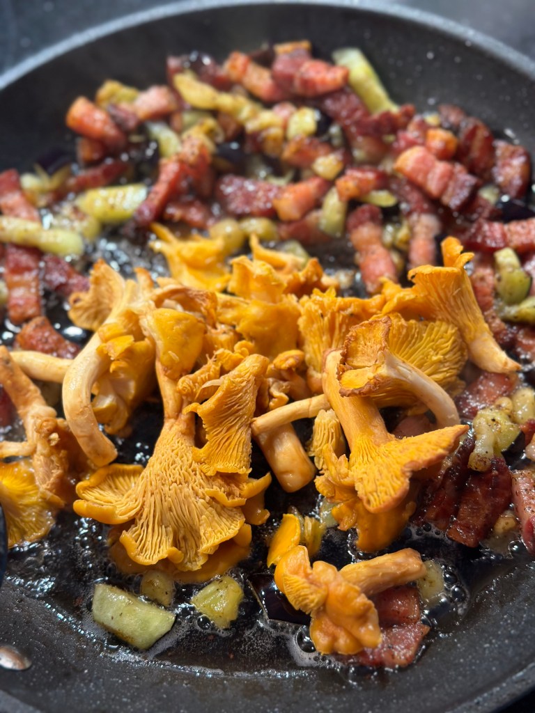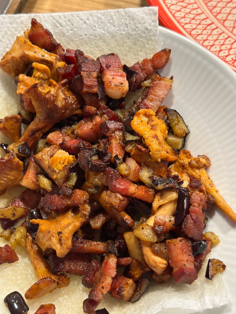 Først brassiere jeg pancettaen, tilføjer aubergine (som først har ligget i salt og siden presset i hånden og skåret i tern. Kantarellerne kan jeg godt røbe for dig, at dem gider jeg ikke børste, så de vaskes i koldt vand. Jeg opfatter det som en skrøne, at de bliver for vandet… Tager pancetta, aubergine og kantarellerne fra og steger løg, hvidløg og tilsætter spinat.