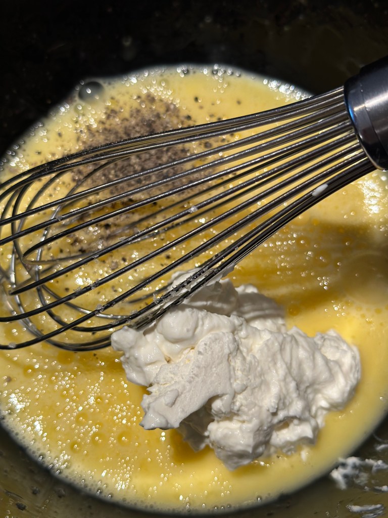 Bunden er klassisk møjdej, og fyldet er klassisk æggeblanding med fløde og ost.