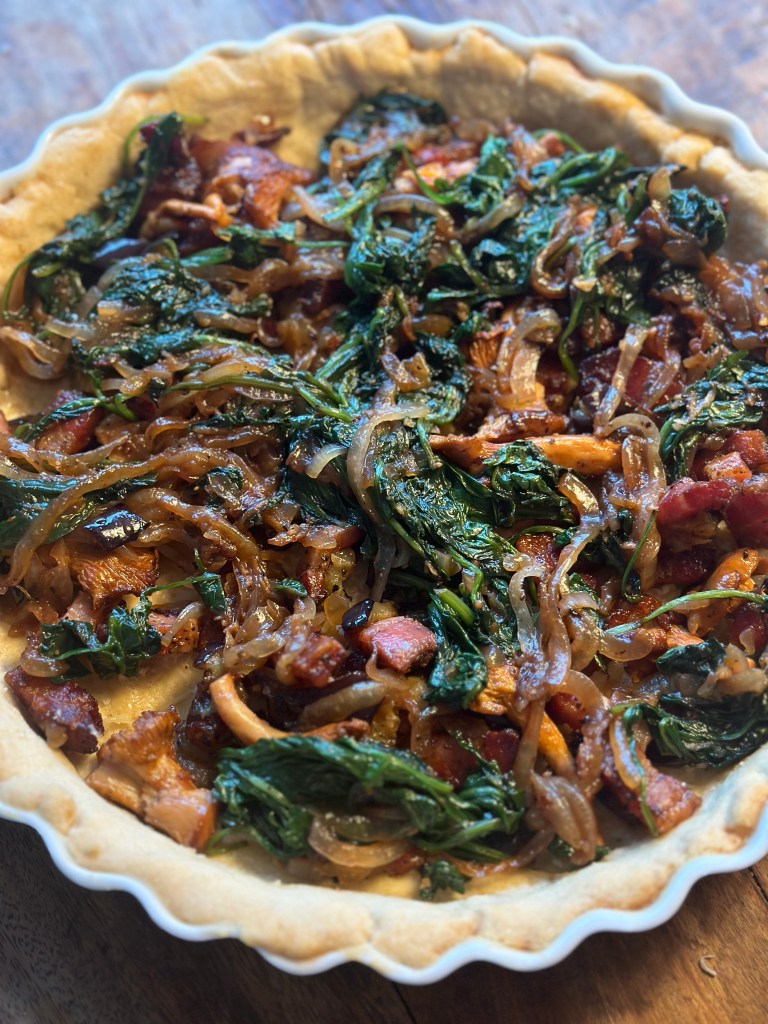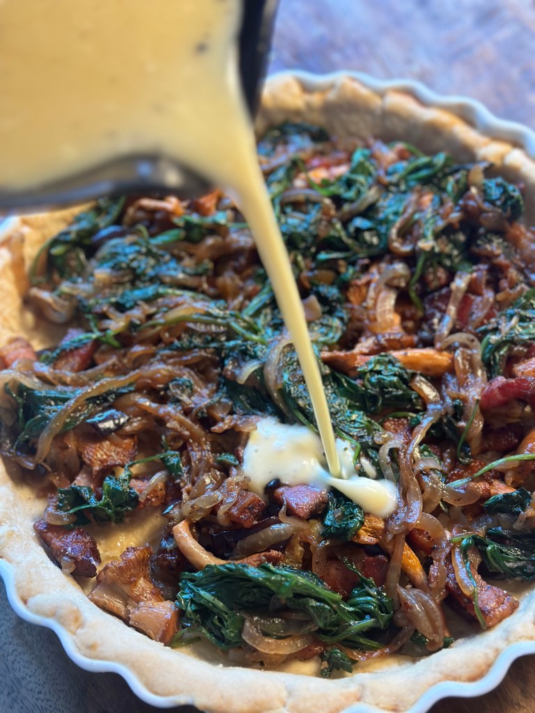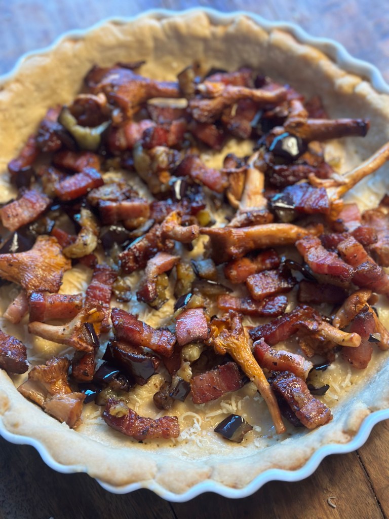 Jeg pensler dejen med æggemassen. Lægger først pancetta, aubergine og kantarellerne og herefter løg, hvidløg samt spinat. Fordeler godt, og hælder æggemassen over. Tager et par klatter ricotta.