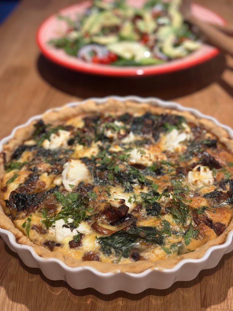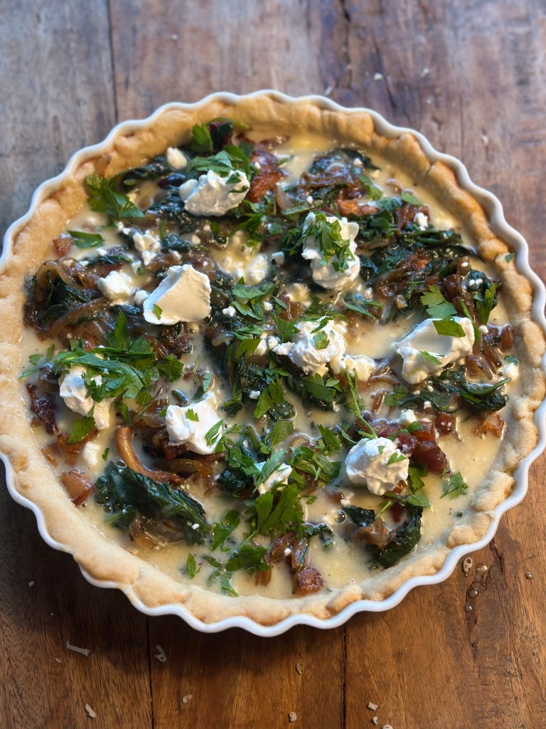 - Quiche Lorraine er med bacon eller pancetta, æg og fløde, ofte med ost.