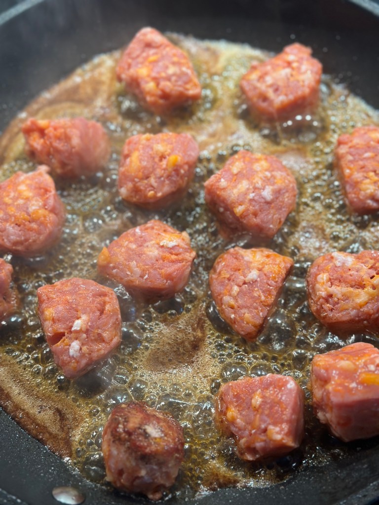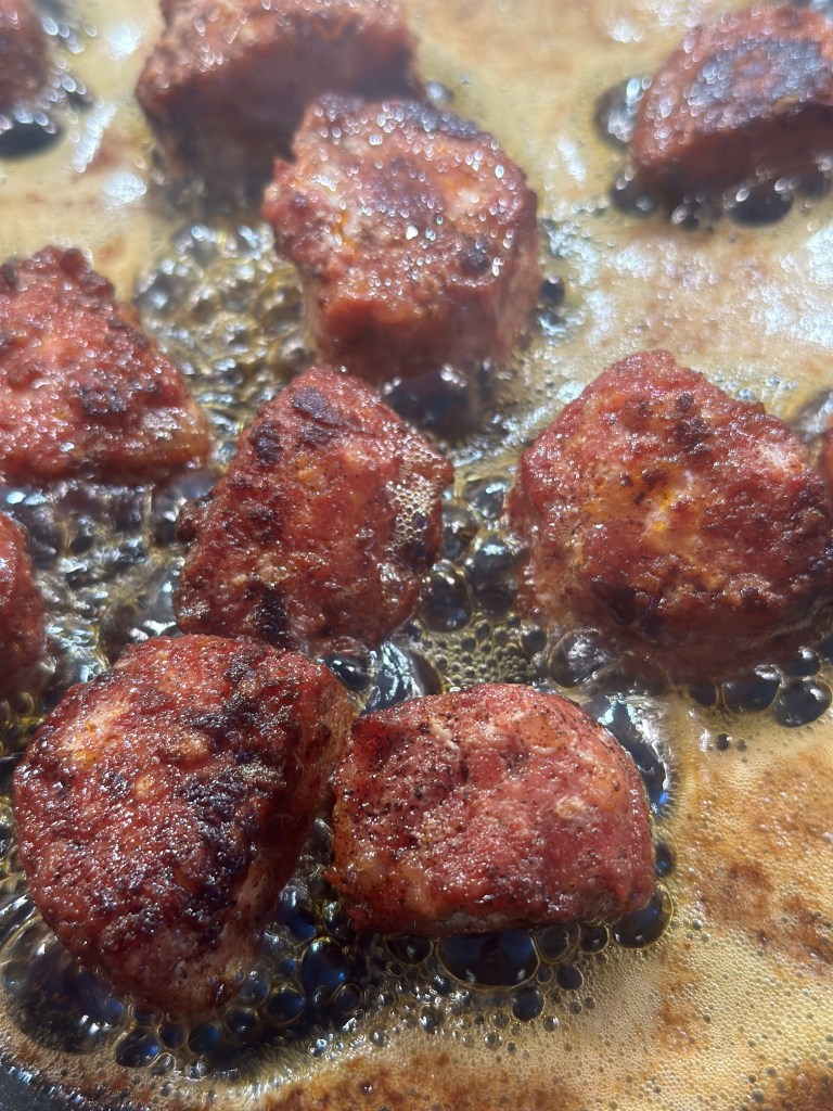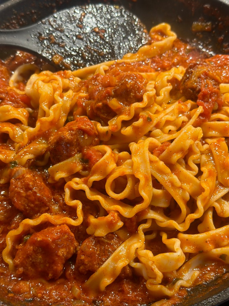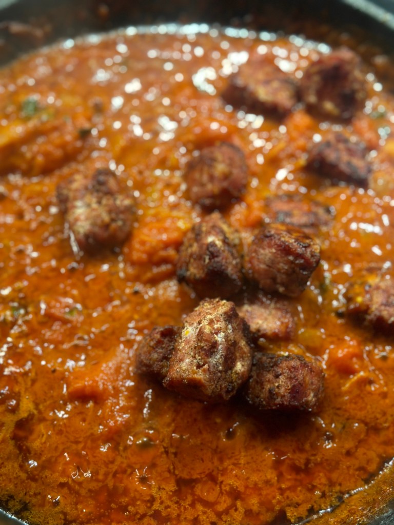Kødbollerne er blot format af “Pasta di Lucanica”, som er den ultimative fars, og kommer fra Trentino regionen i Norditalien. Den er købt færdig til denne ret fordi det er nemt, men også noget man næsten ikke kan lave selv med samme kvalitet og smagsoplevelse. Den er lavet af magert svinekød som er groft hakket og krydret med salt, peber, chili og hvidløg. Kødfarsen er Salsiccia – som jo egentlig er Italiensk pølse. Men netop denne pølse, bruges faktisk mere almindeligt ved man tager den ud af tarmen, og benytter kødfarsen i retter – som fx. denne.