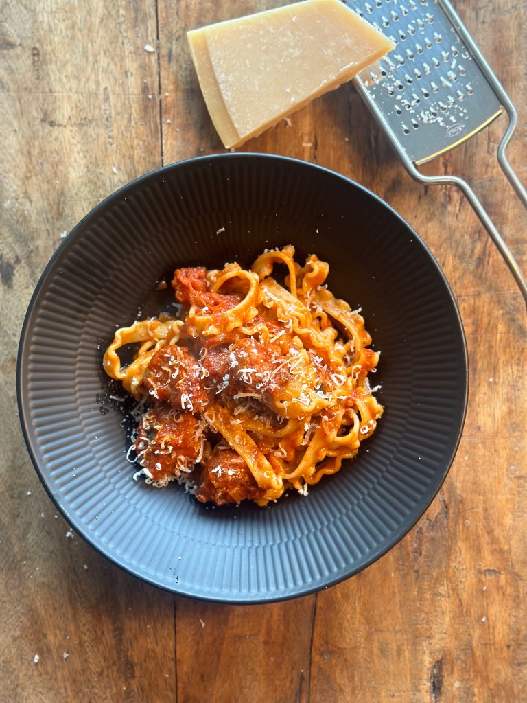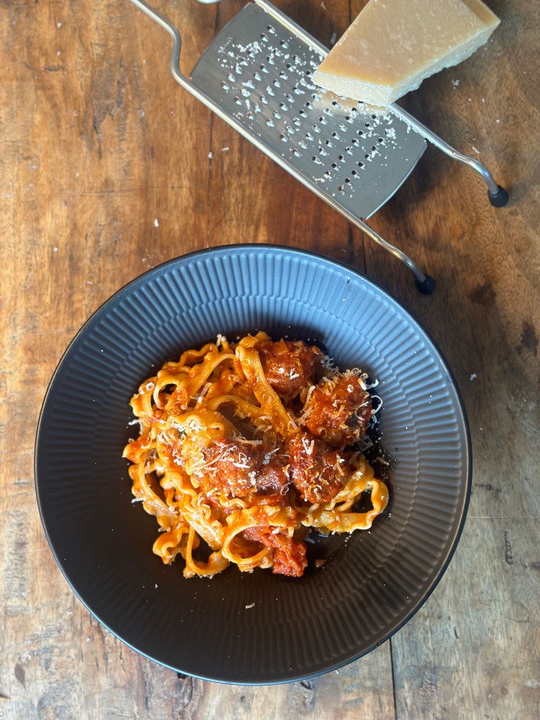 Men det er en klassisk Italiensk ret – spagetti med kødboller i tomatsovs, som bliver bedre af at tage de rigtige valg af ingredienser. Jeg vælger kvalitets tomater på dåse fra Italien.