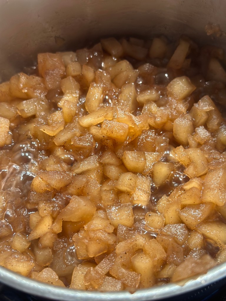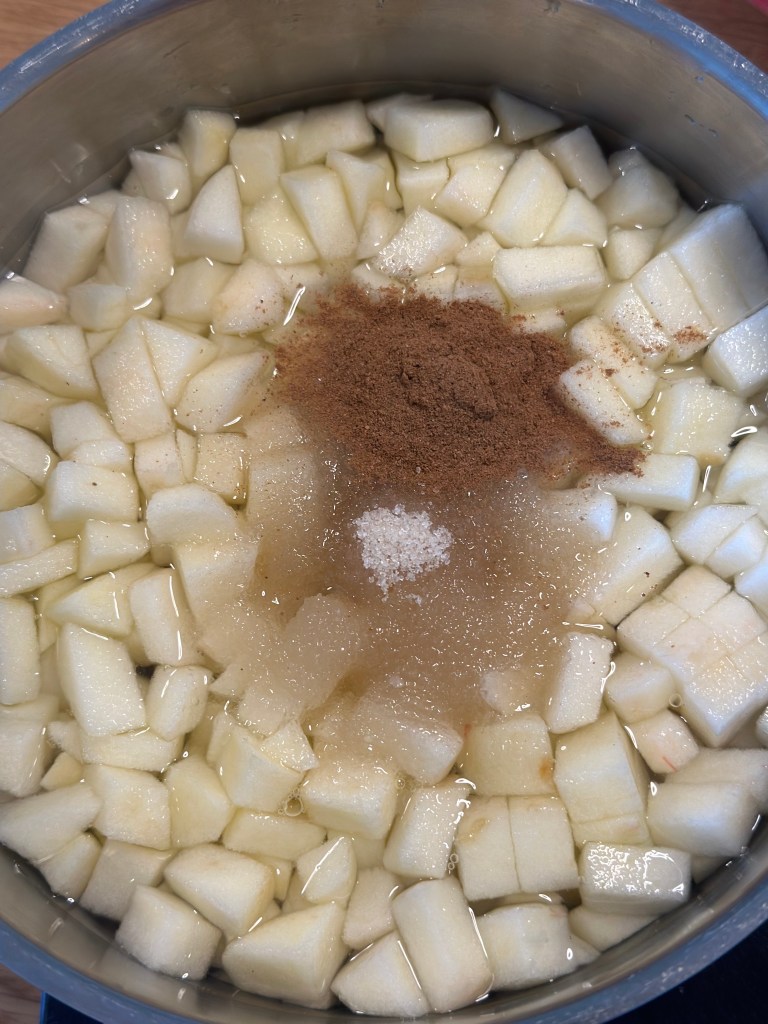 Jeg skræller æblerne, og skærer dem i tern som er ca. 1/2 cm på hver led. Kommer dem i en gryde, og dækker dem med vand. Tilsætter sukker og kanel, og lader dem koge ind i en times tid.