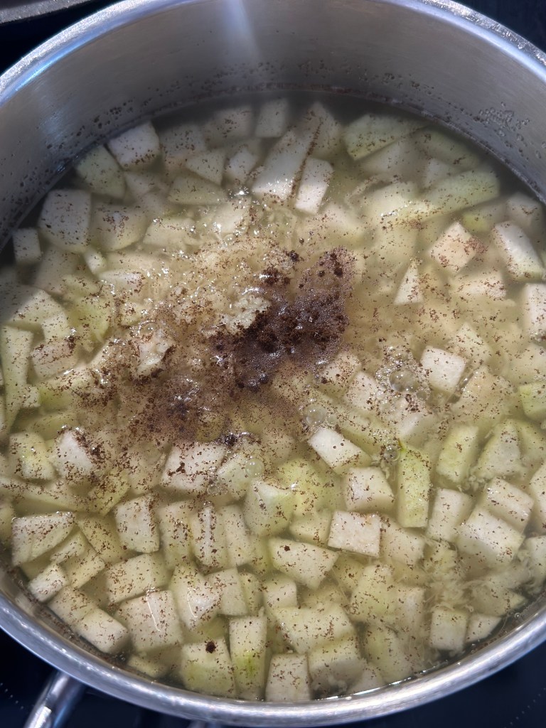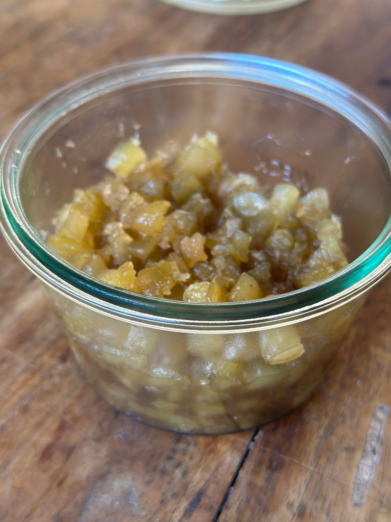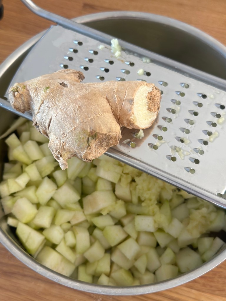 Pærene skrælles og skæres i tern. Ingefæren skrælles og rives i kasserollen med pærene. Lime presses, og sukkeret tilsættes. Tilfør vand, så det lige dækker det hele. Bringes i kog og simrer til det er mørt og godt snasket.