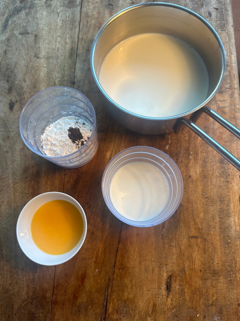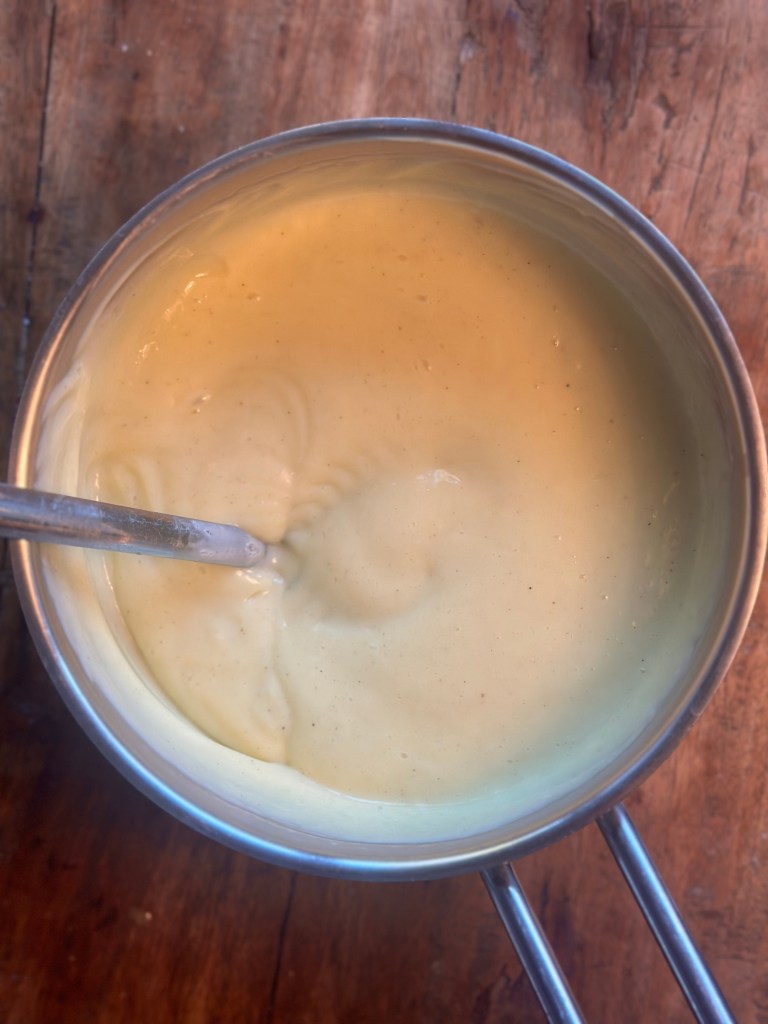 De øvrige ingredienser shakes godt, og tilsættes mælken når den rammer kogepunktet. Pisk godt til den tykner. Hvis du vil have den lidt mere “gul”, tilsæt en anelse gul kulør. Cremen sættes på køl og kan laves dagen i forvejen.