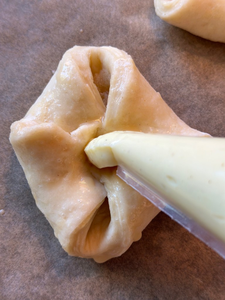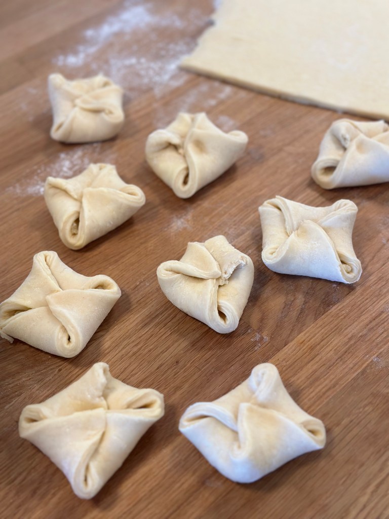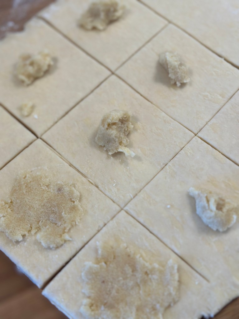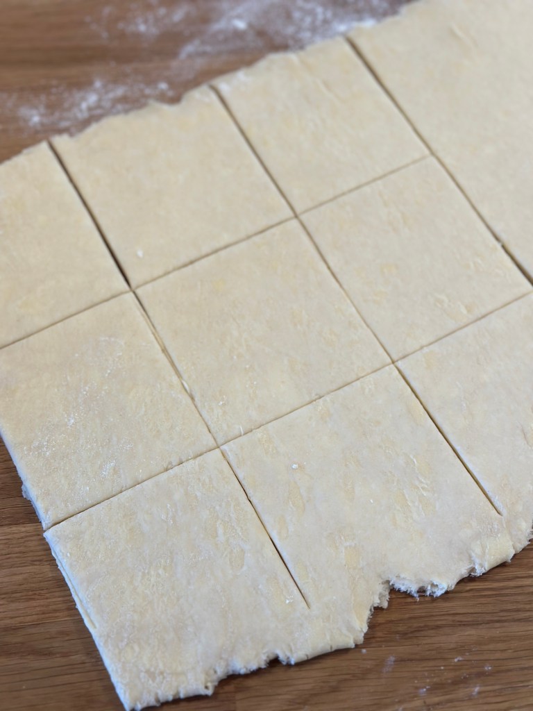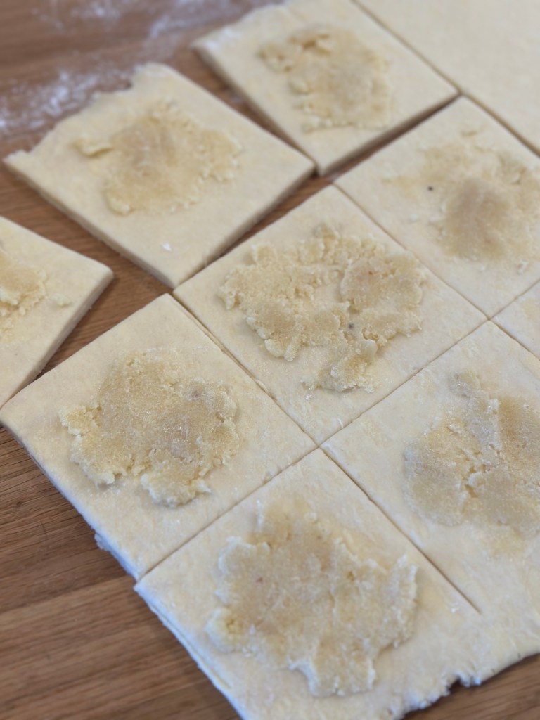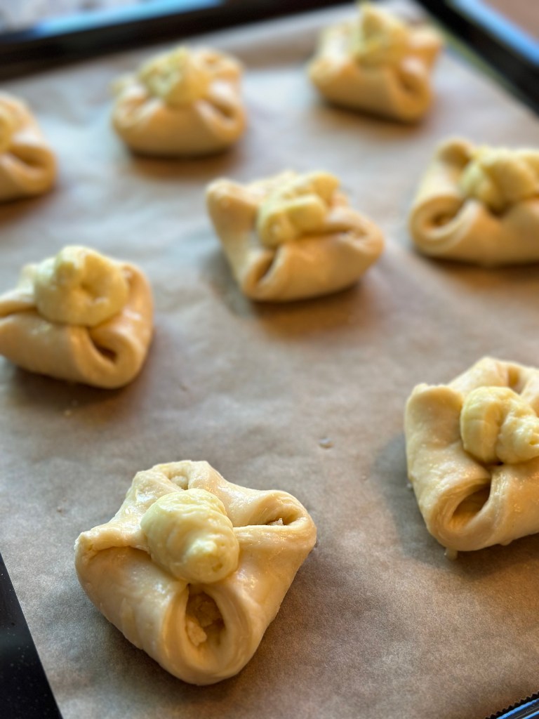 Dejen rulles ud som til croissants, men i steder for trekanter, skæres ud i firkanter.