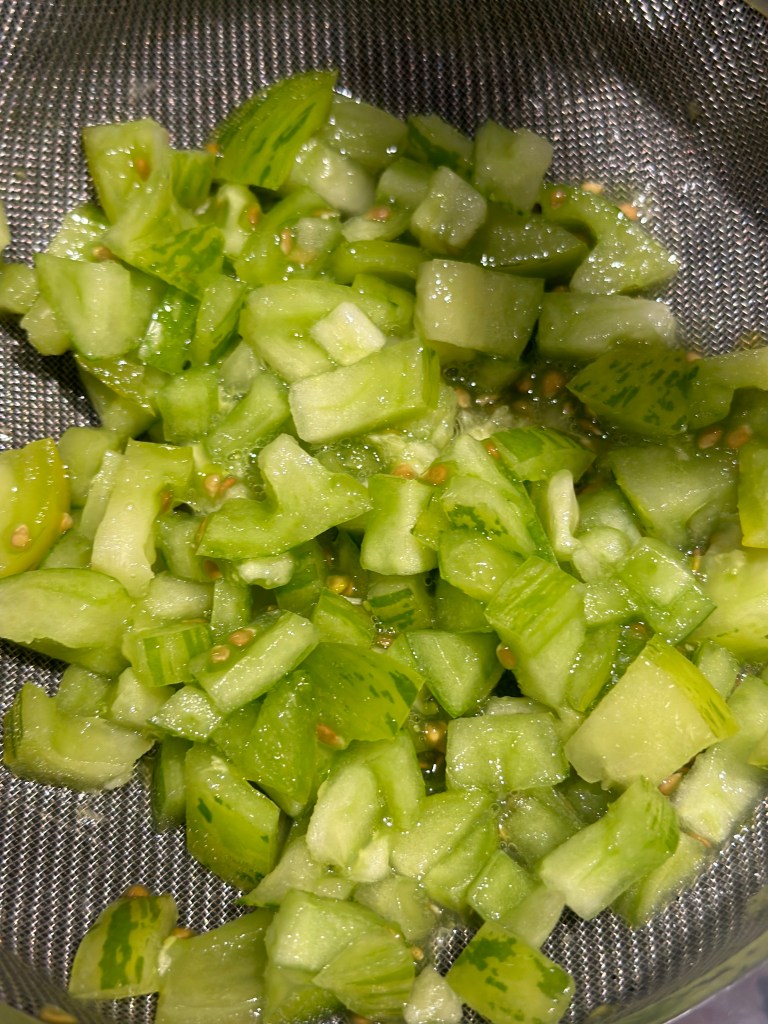 Jeg bruger tomater med meget “kød”, og derfor dur det ikke at fjerne kerner og saft. I stedet skærer jeg den i tern, og lægger dem i en si til at dryppe af. Agurken fjerner jeg kernerne, og skærer også i tern – samme størrelse som tomaterne.