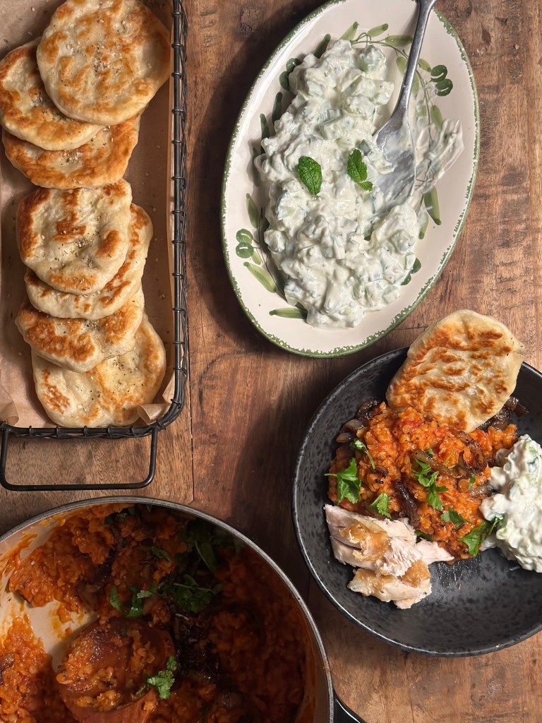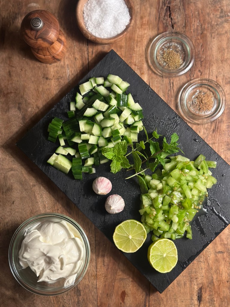 Jeg laver en dressing af Yoghurt, hvidløg som rives eller presses, saft fra lime, samt alle krydderierne og fint snittet mynte.