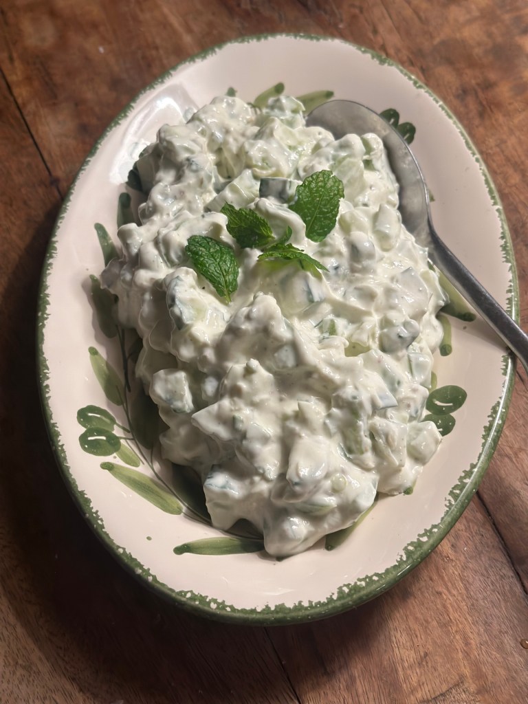Men hvorfor ikke blande begreberne lidt ? Jeg synes en Raita passer supergodt til Daal, og den jeg laver her, er en kombination imellem GRØNTSAGS RAITA og MYNTE RAITA.