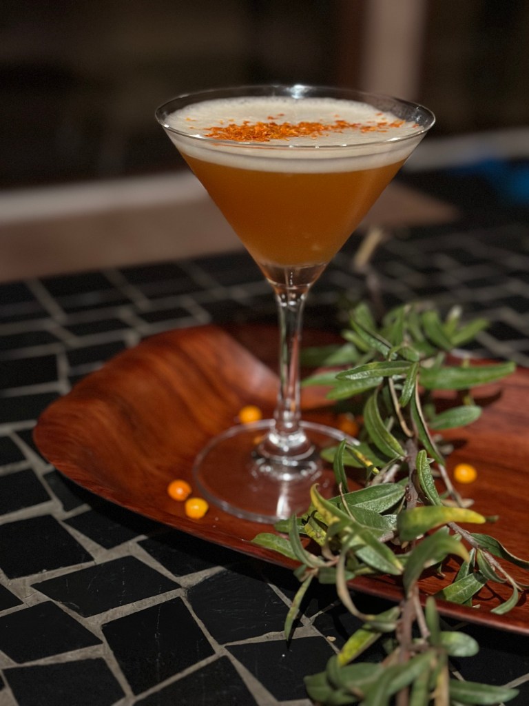 Hæld i et cocktailglad og drys med Høstet havtorn flager.