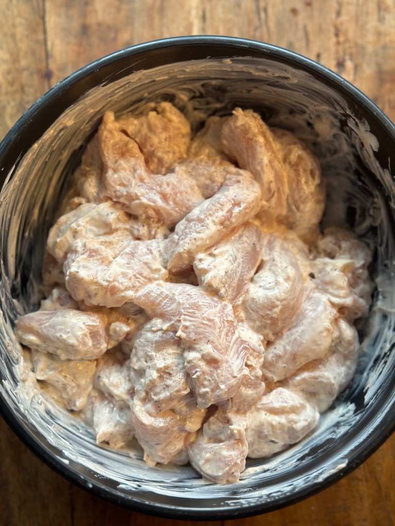 Kyllingen skal først marineres i yoghurt, 1 spsk Garam masala, og saften fra den halve citron. Sæt på køl i mindst en time, men gerne et døgn.
