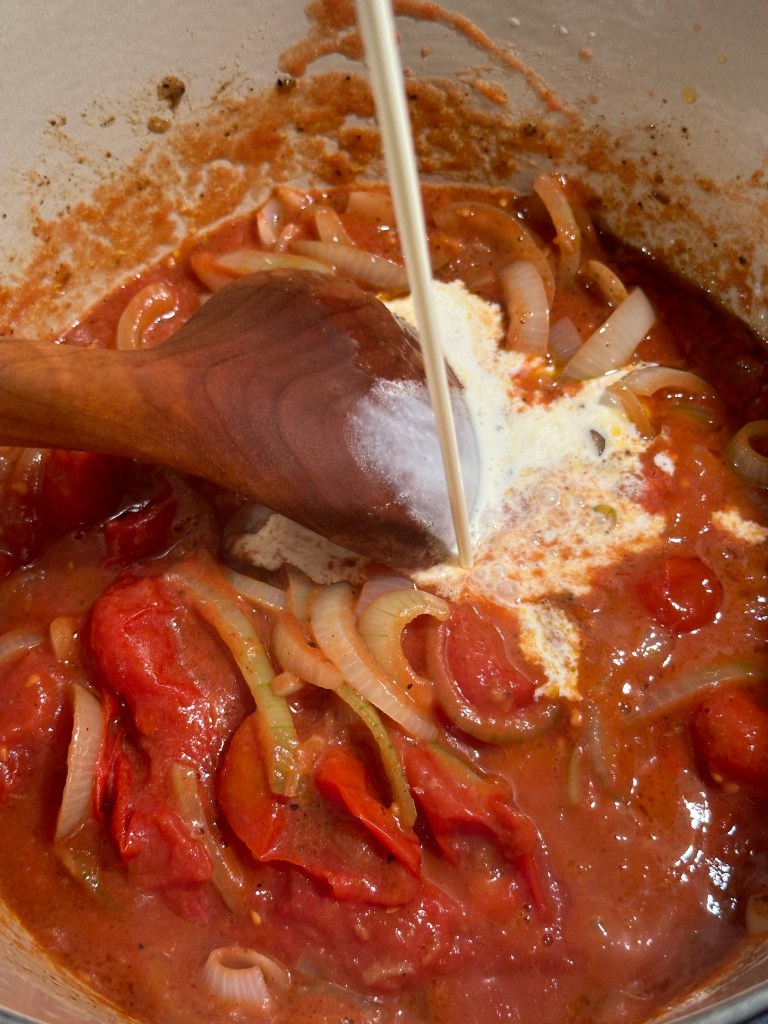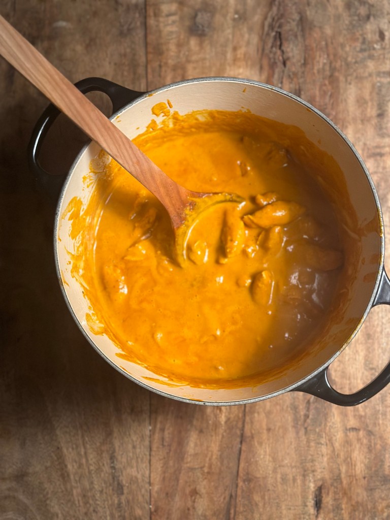Steg løg og hvidløg sammen med 1 spsk Garam masala i smør. Tilsæt 1 dåse gode hakkede tomater og fløden. Tilsæt salt og peber. Lad den koge sammen og simre i 20 minutter. Herefter skal sauces blendes, herefter igennem en si, og tilbage i gryden. Kyllingen kommer i, og retten simre i ca. 30 minutter.