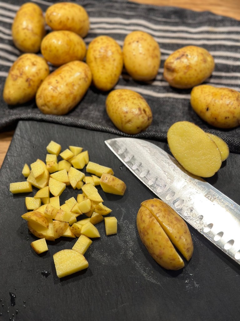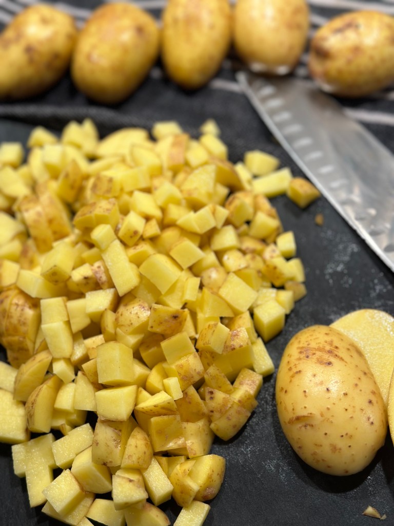 Skær kartofler i tern – regn med 3 mellemstore pr. person – plus det du gerne vil have til dagen efter. Behold skrællen på.