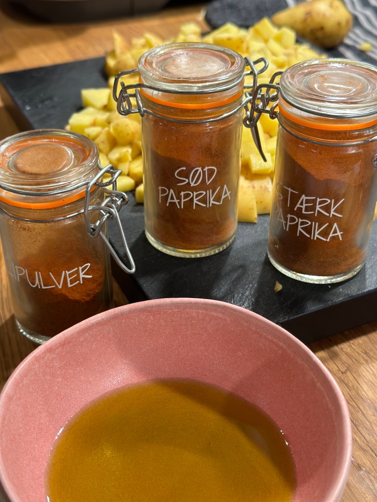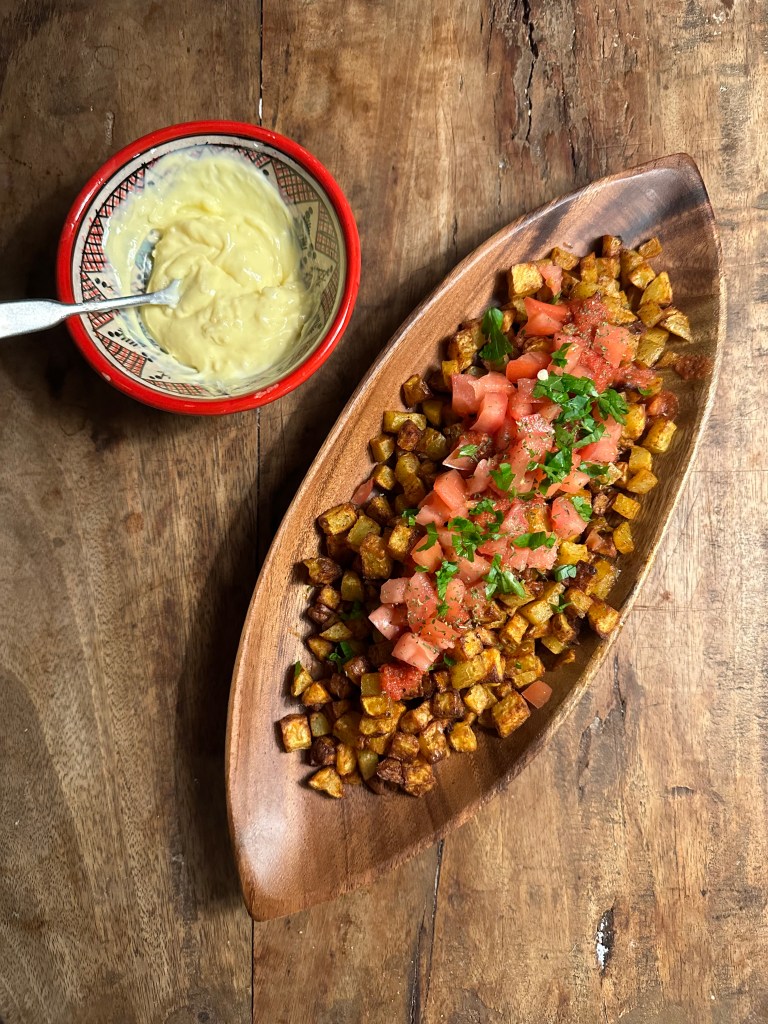 Patatas betyder kartofler, og “bravas” betyder “vovede” eller “vilde”, og refererer til de godt må være lidt stærke. Oprindelige blev de serveret med en tomatsauce med paprika, men oftere i dag med aioli. Se min opskrift på aioli her !
