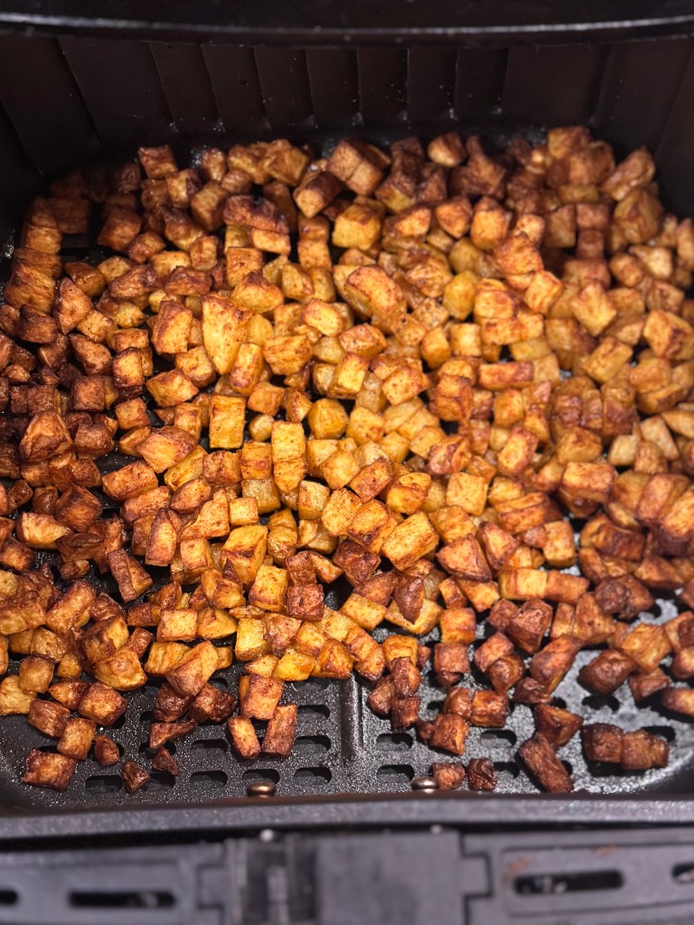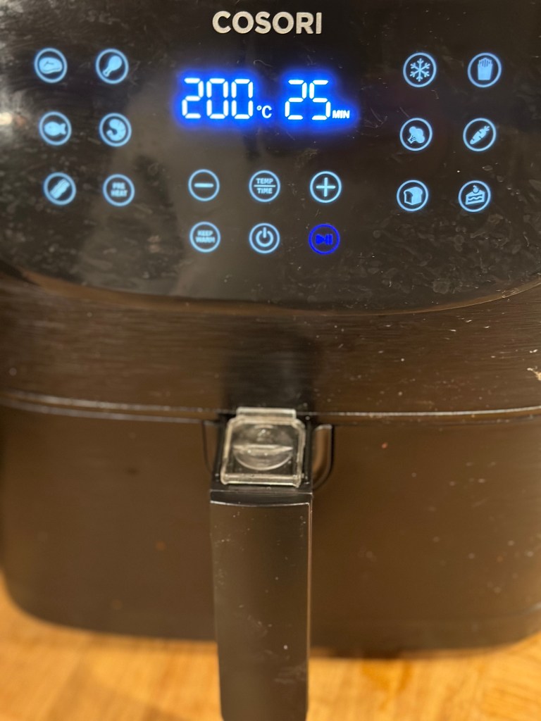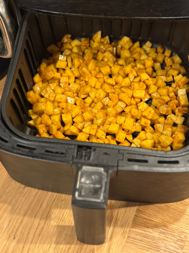 I airfryeren i 25 minutter ved 200 grader – ryst dem gerne et par gange.