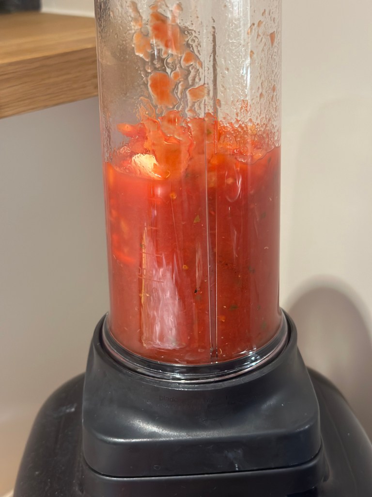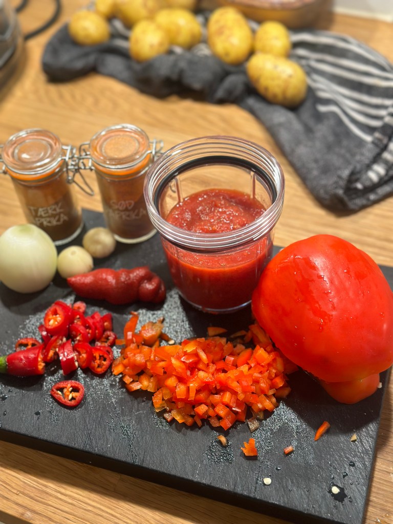 Alle ingredienserne kommes i en blender og herefter i en kasserolle, og koges op. Det skal simre i mindst 20 minutter, således smagene integreres med hinanden.