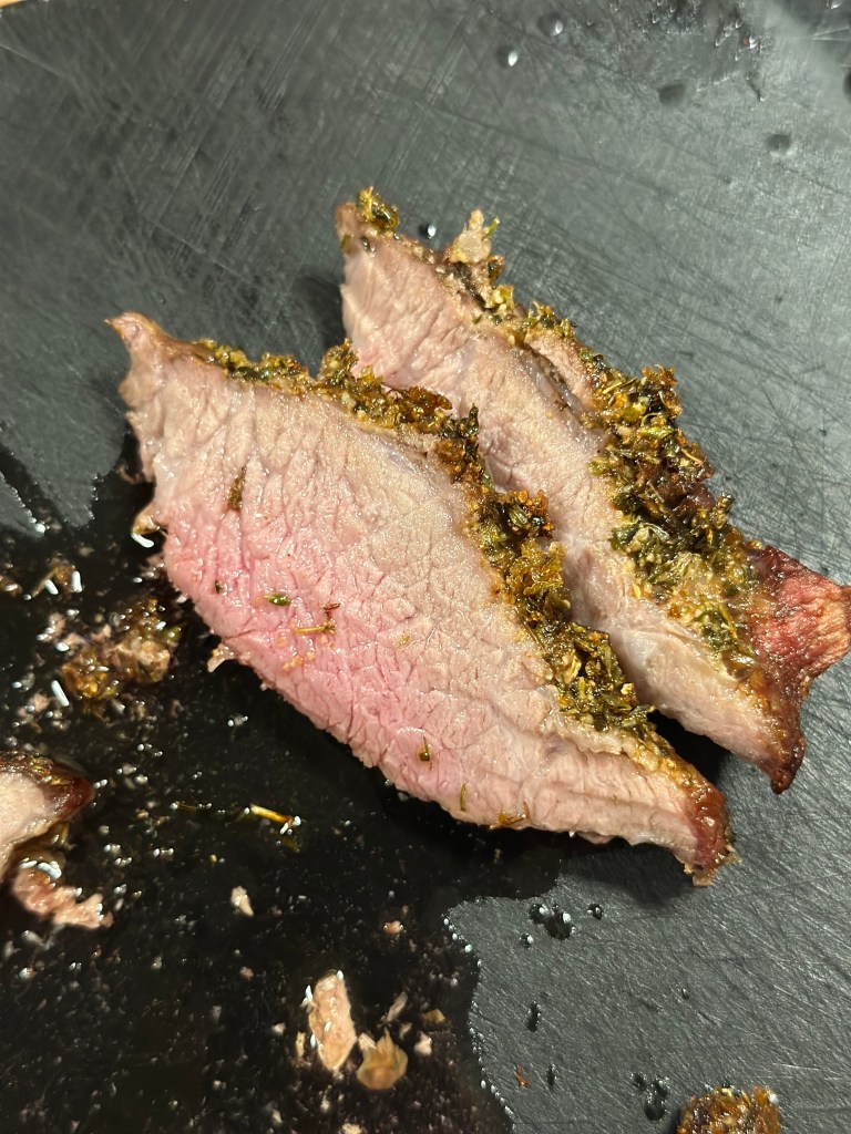Gnid det godt ind, og stegt stykket på ca. 1,2 kilo i 45 minutter ved 170 grader. Kernetemperaturen er ca. 55 grader. Den skal hvile i mindst 30 minutter.