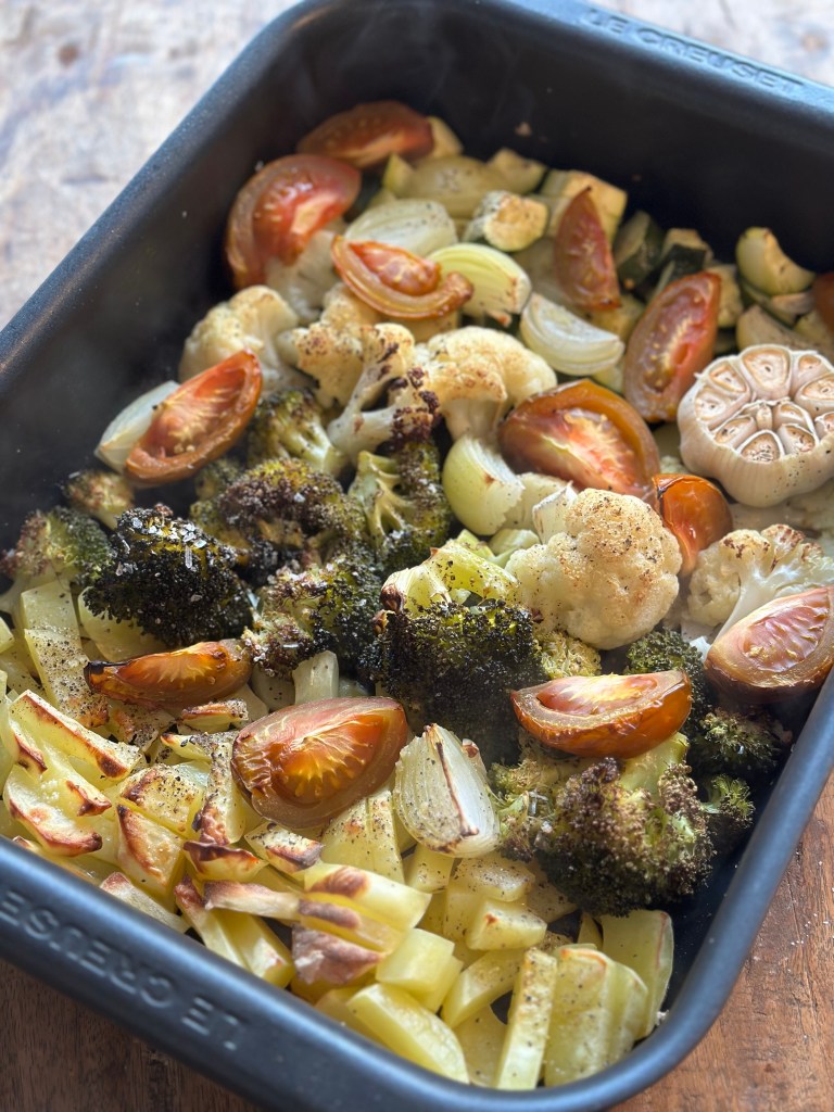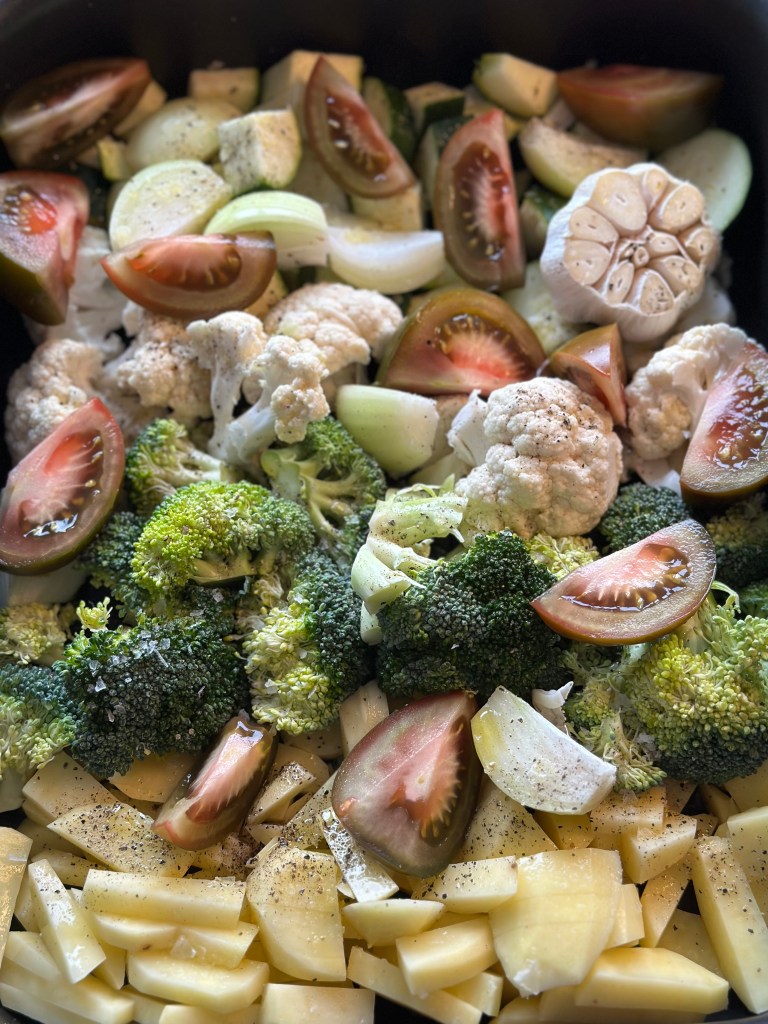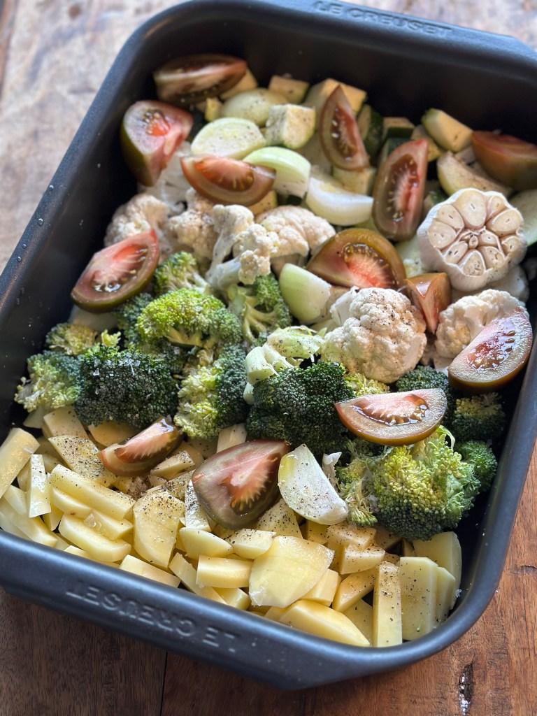 Kartofler skælles, og alt skæres i mindre stykker. Husk at skylle grøntsagerne. Kommer i ovnen med olivenolie, salt og peber.
