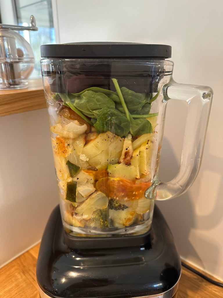Den bygges op af, at man først bager en del af grøntsagerne i ovnen, og blender sammen med de sidste ingredienser.