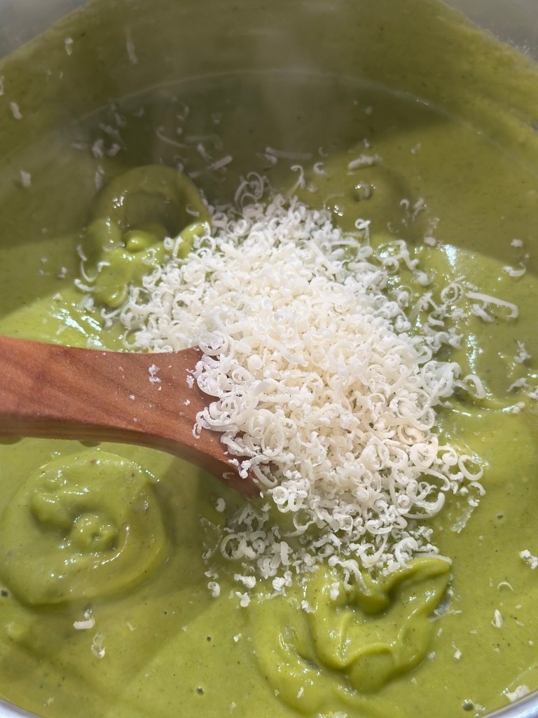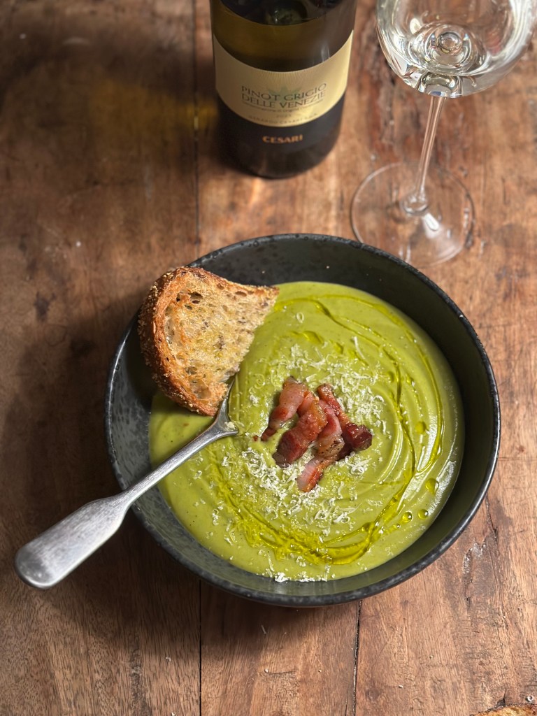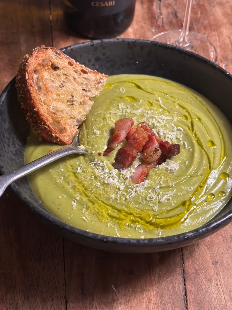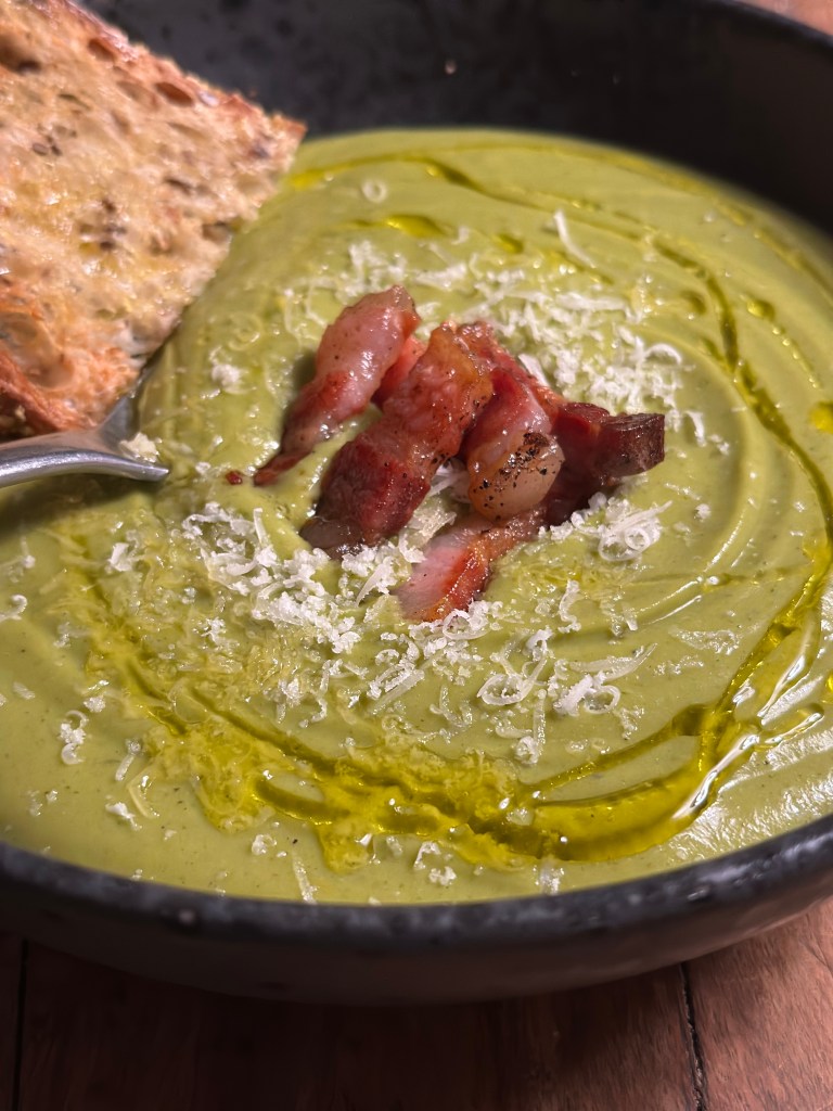 Suppen serveres med et par cirklet virkelig gos olivenolie – jeg anbefaler en Græsk, og Pancetta på toppen, som dog kan undlades, hvis du er vegetar. Drys lidt parmesan over – det vil du ikke fortryde.