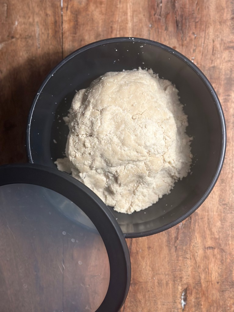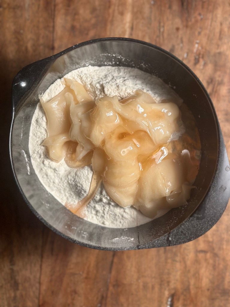 Varm honningen op til den er flydende, men ikke over 40 grader. Bland melet i. Dejen bliver hård som sten, og som sådan sættes den i køleskab. Jeg plejer at røre den i en røremaskine først, og derefter samle den med hænderne. Når den sættes i køleskab, skal det være i en lufttæt boks.