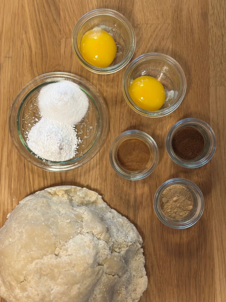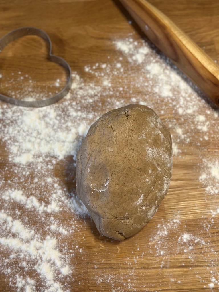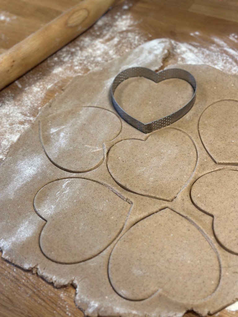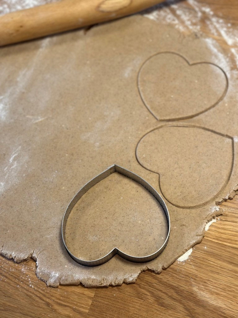 Rul dejen ud på et meldrysset bord i ca. 4 mm tykkelse. Udstik som du ønsker dem. Kom på en bageplade med bagepapir, og bag i en forvarmet ovn i 8 minutter ved 180 grader – midt i ovnen. I mens første omgang er i ovnen, kan du samle og udrulle dejen igen, og udstikke et nyt sæt. Fortsæt til der ikke er mere dej.