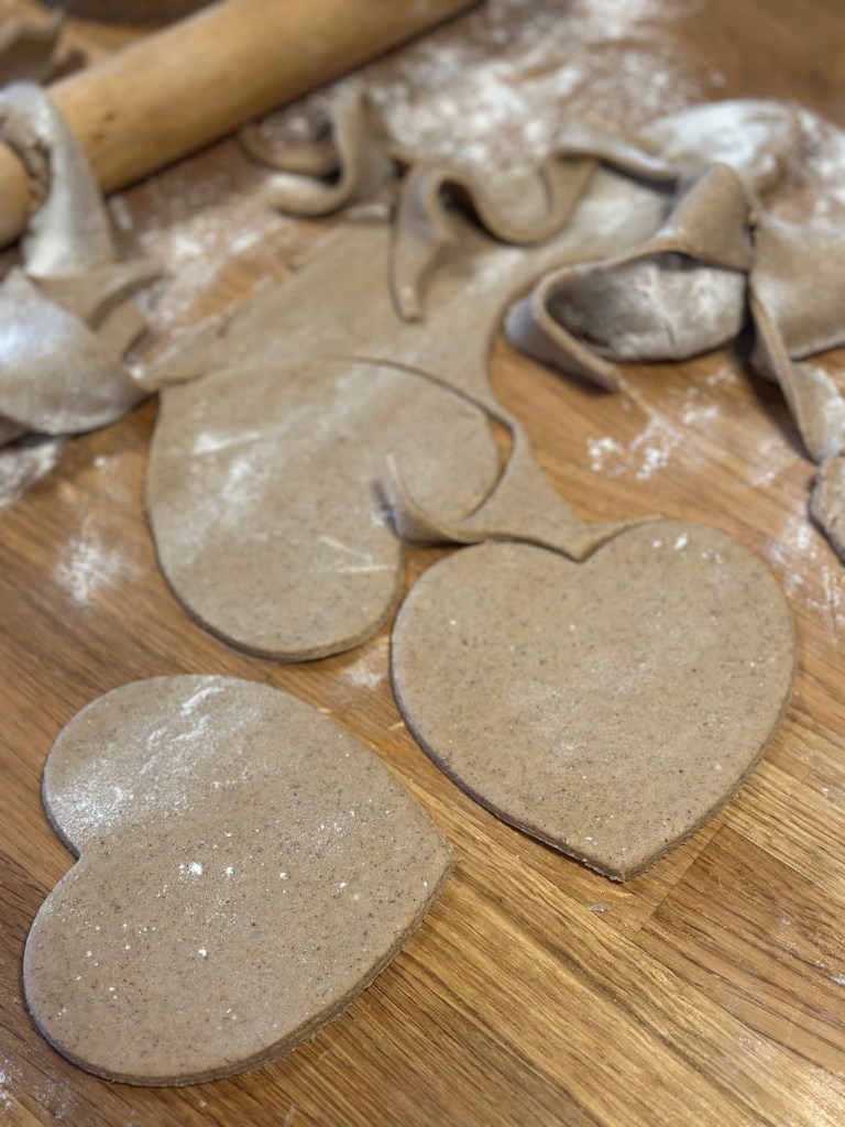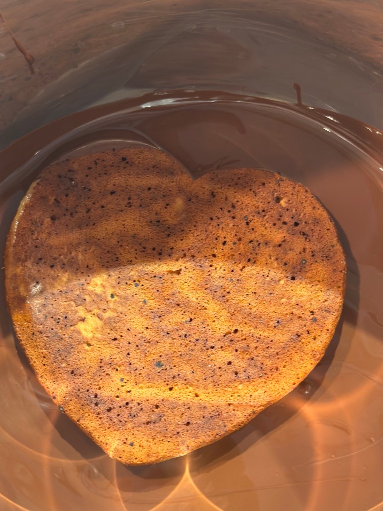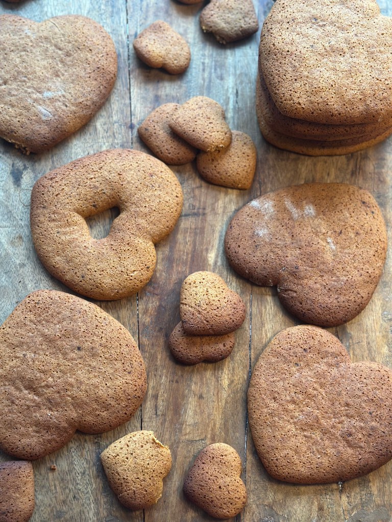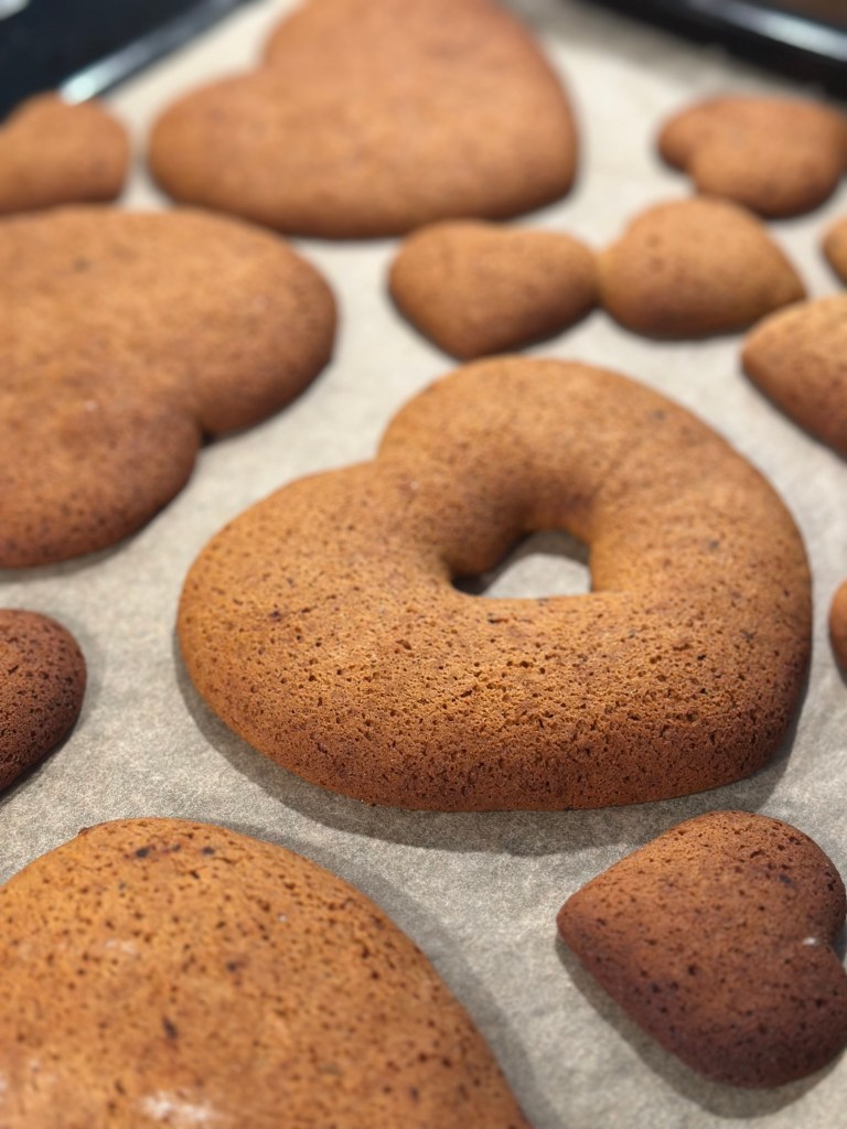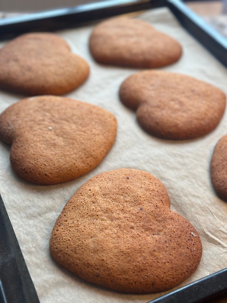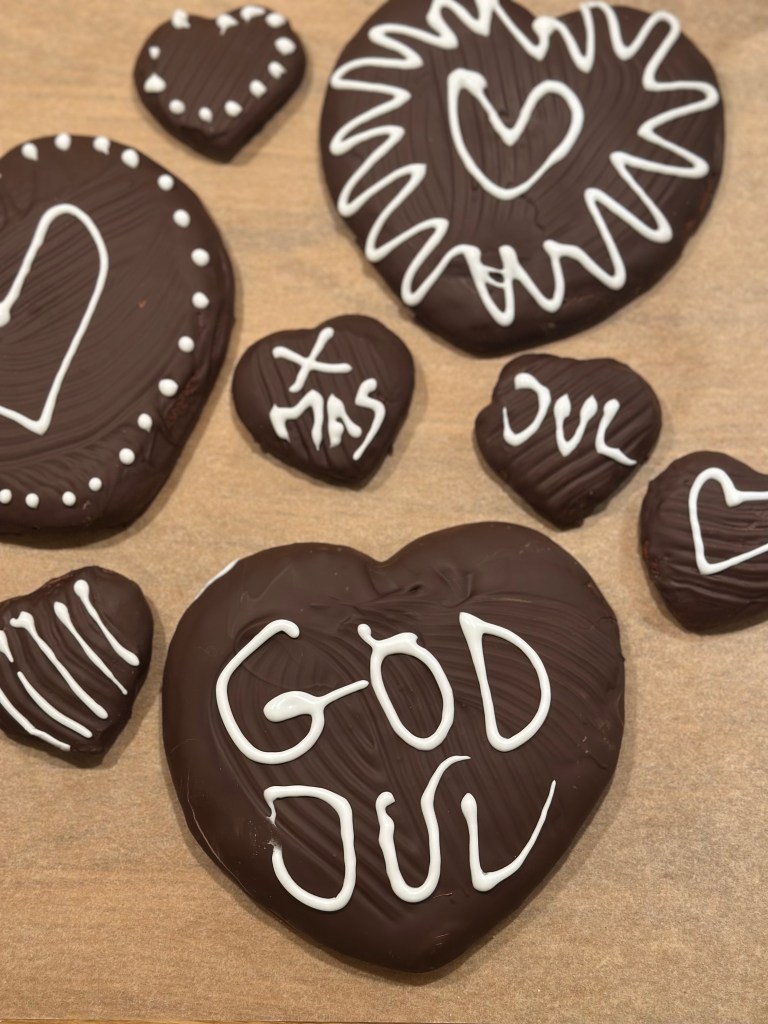 De dyppede honninghjerter skal ikke på en bagerist bagefter (for så får du dem ikke af hele igen), men på et stykke bagepapir. Jeg har forsøgt med med glansbilleder, men det skal være rigtige glansbilleder som kan dette, og ikke opløses… De er fra en svunden tid, så jeg forsøger mig med glasur i stedet.