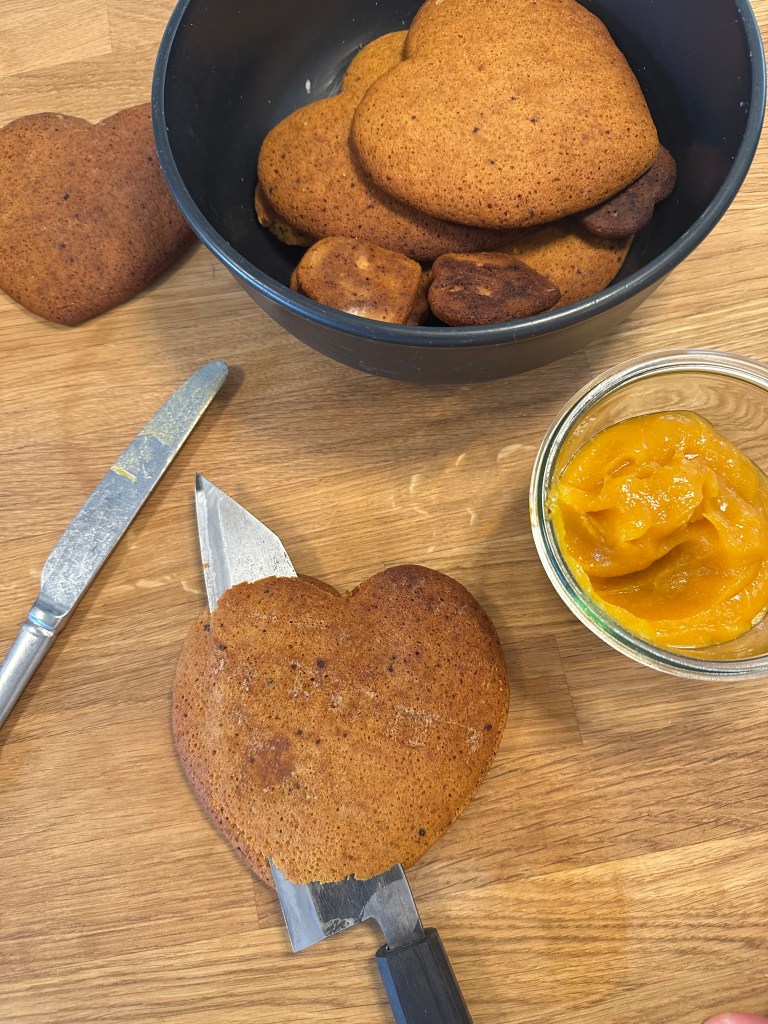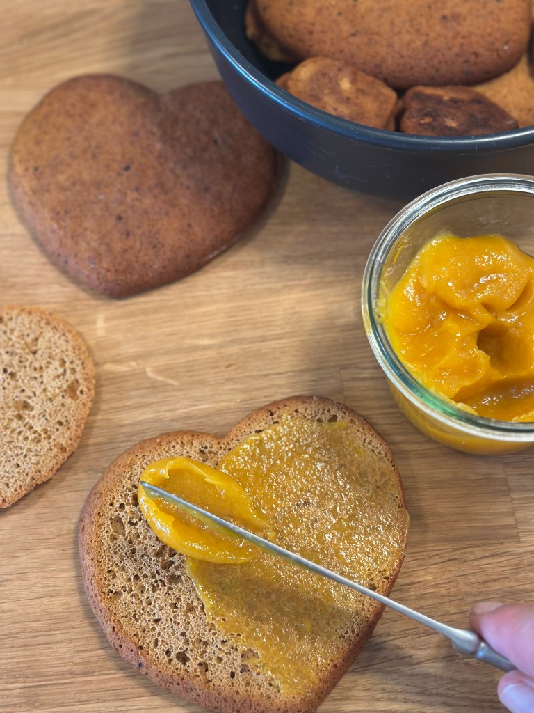 De færdige honning hjerter skæres over med en skarp kniv på tværs. Smøres på den ene side med et fint lag abrikos marmelade. Saml dem igen, og dyp dem i mørk chokolade.