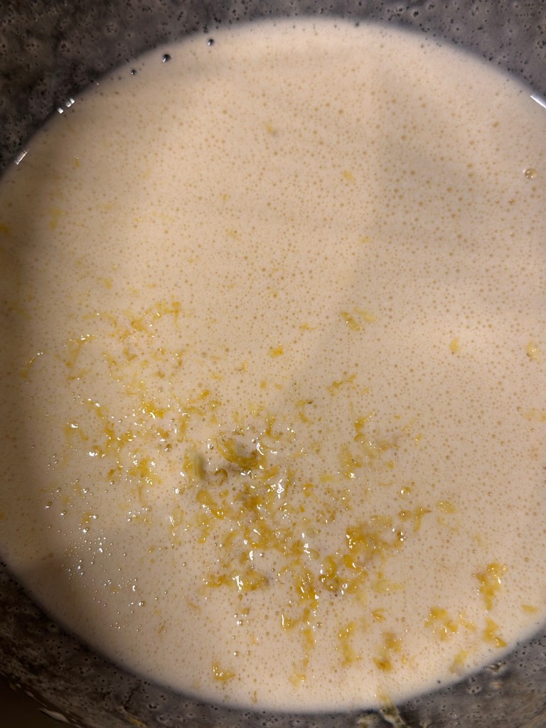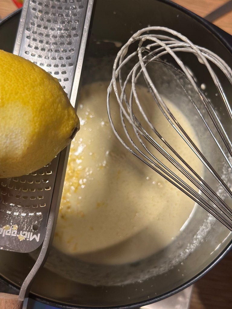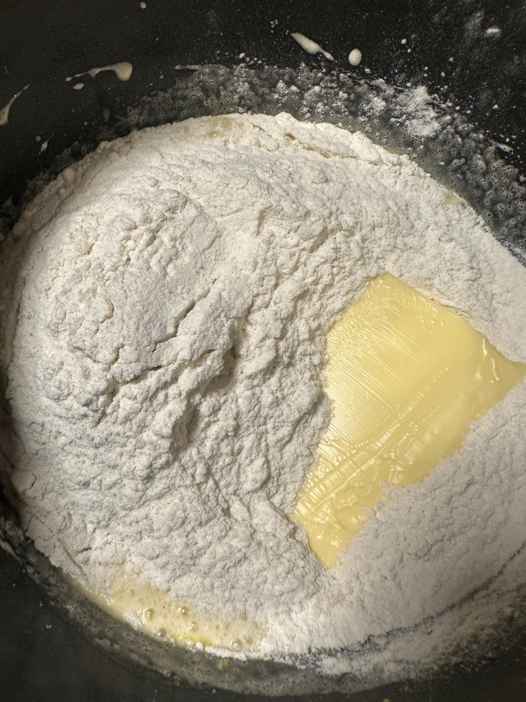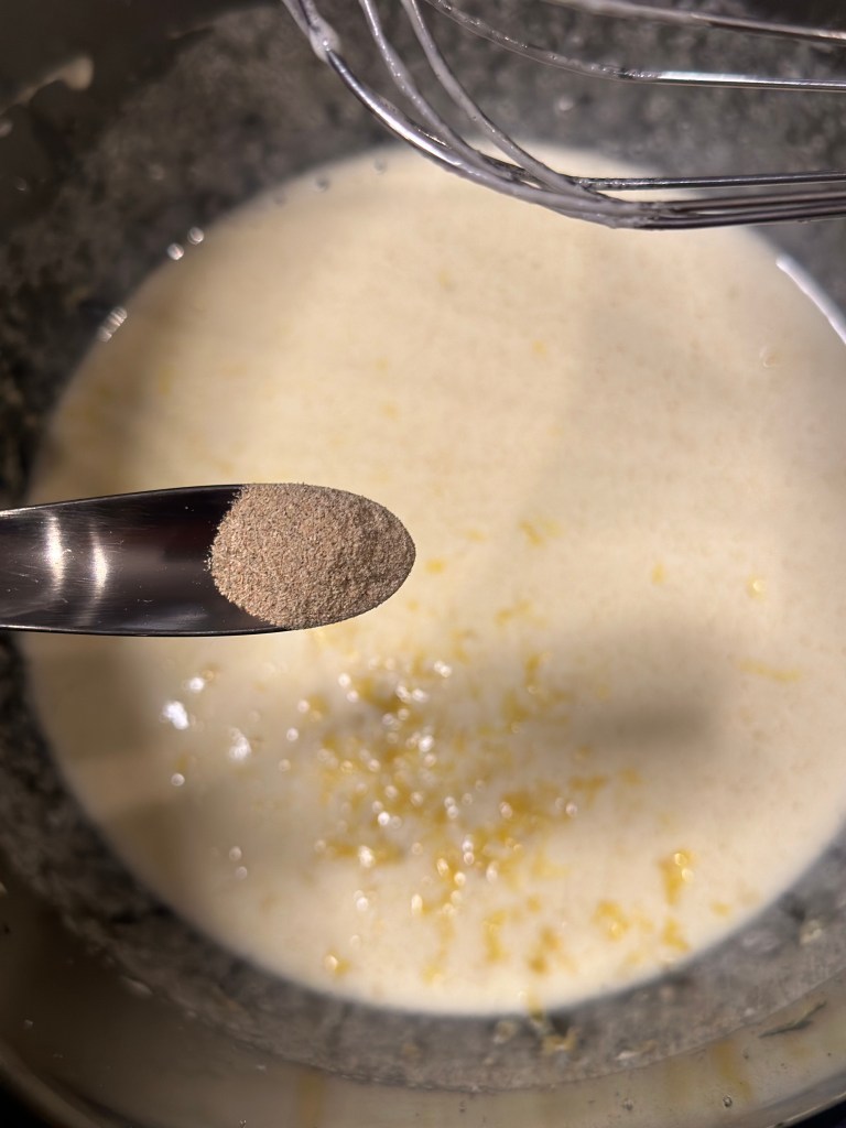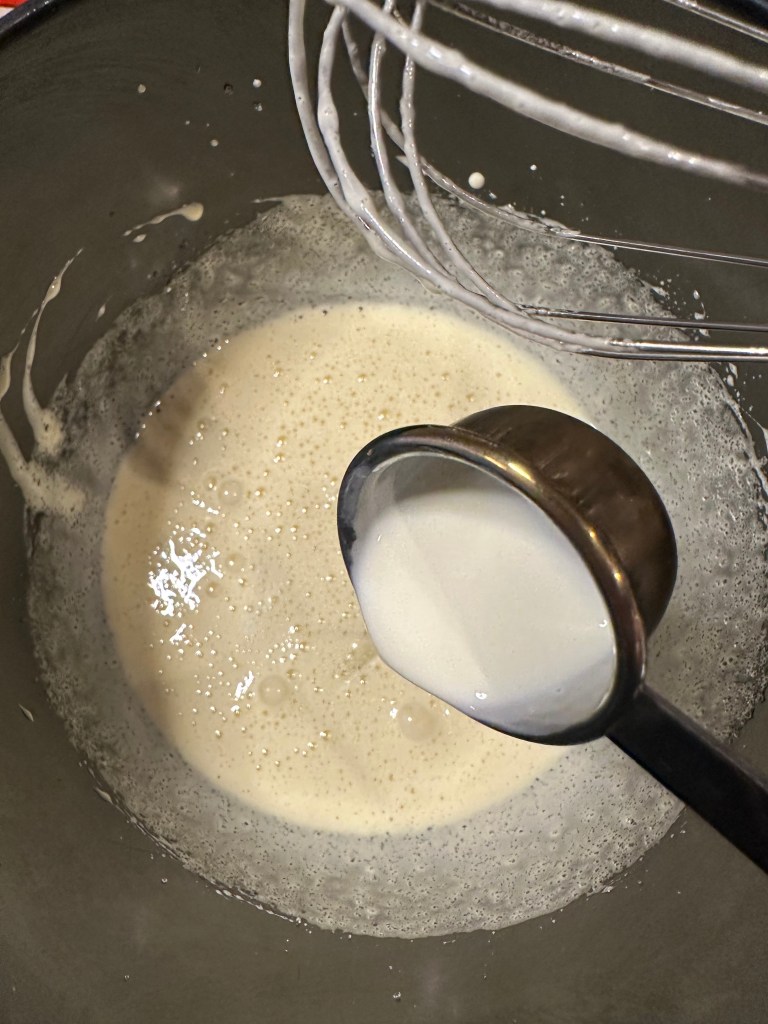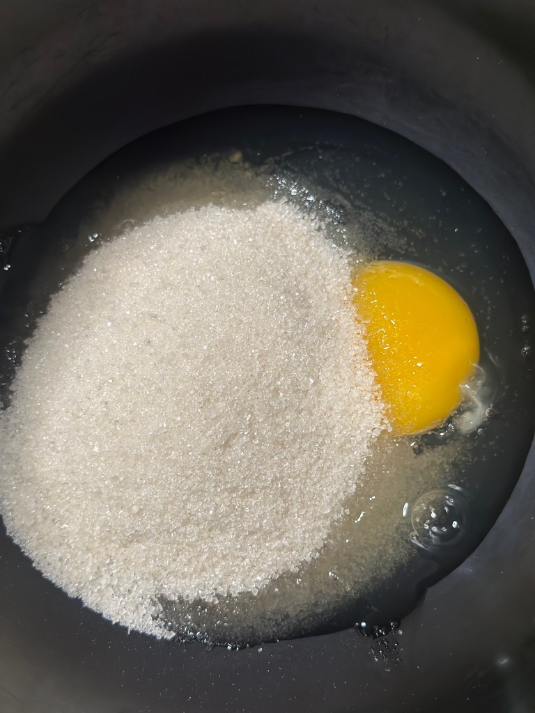 Pisk æg og sukker sammen til det bliver en hvid og luftig masse. Tilsæt de øvrige ingredienser, men vent med melet til sidst – bland de øvrige ingredienser godt før du kommer melet i.
