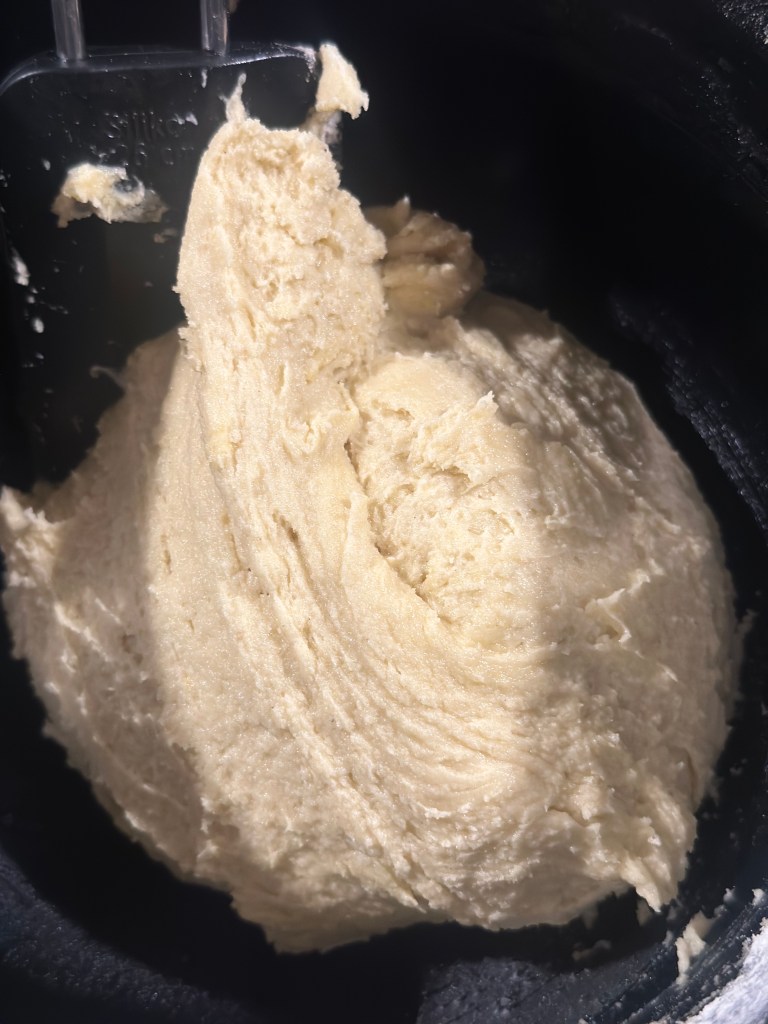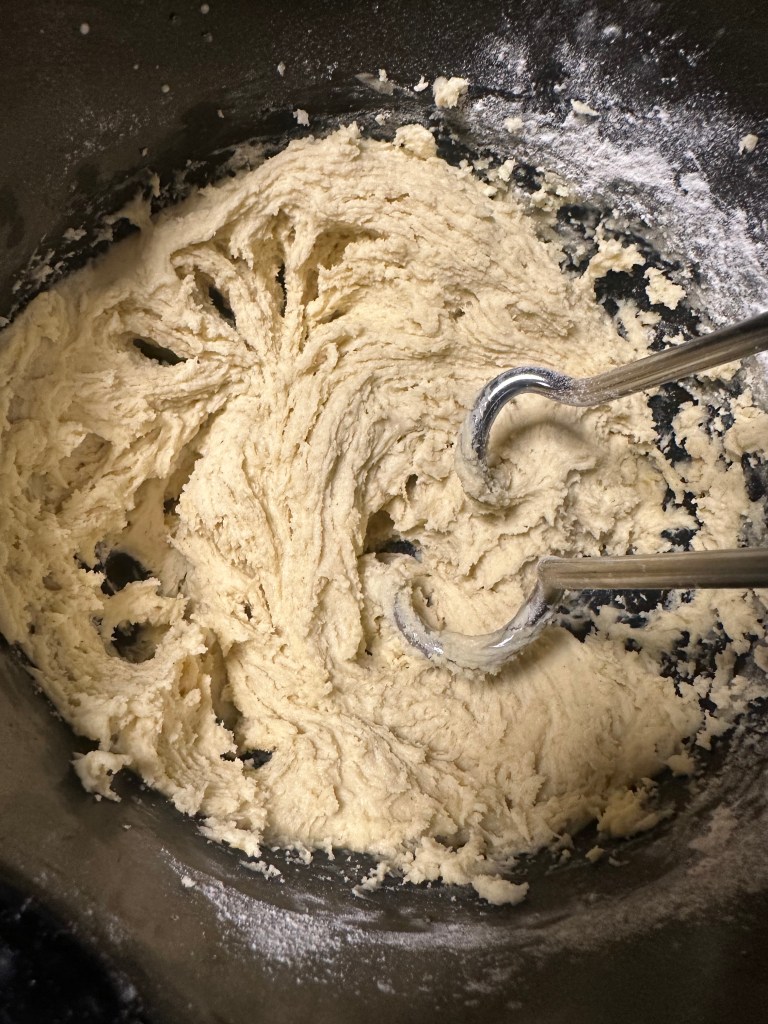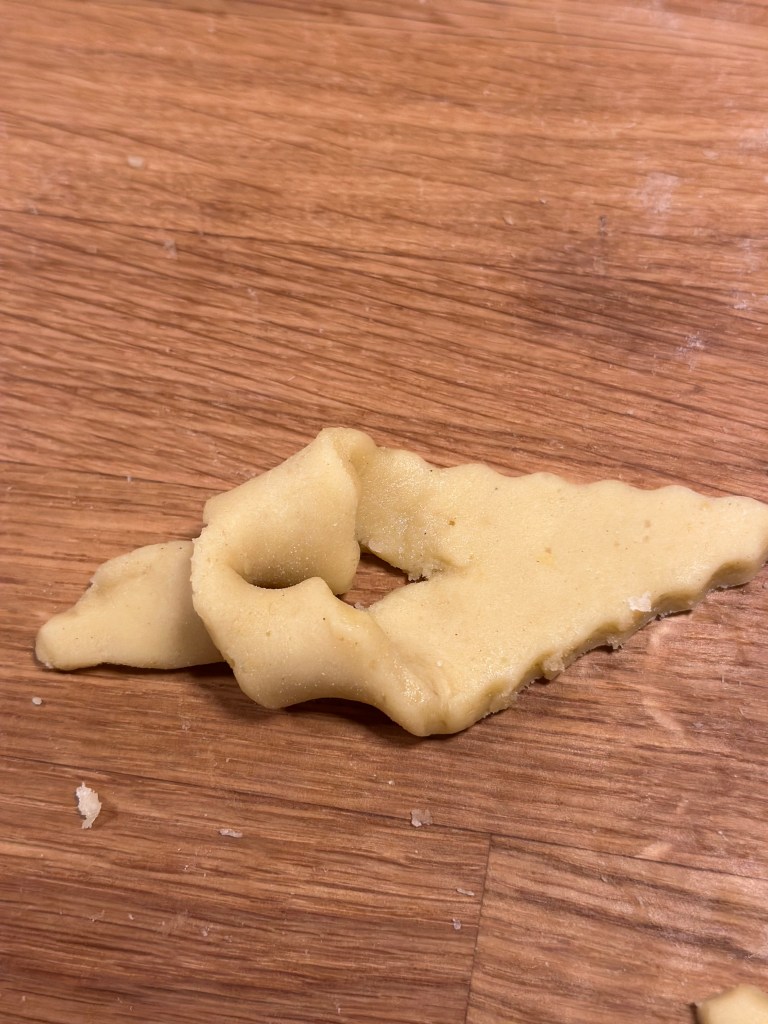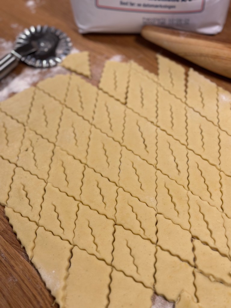 Rul den ud i ca. 0,5 cm og skær dejen med en rullejern – Harlekin skæret. De skal ca. være 6 cm x 3 cm. Lav en ridse i midten, og vrid dem.