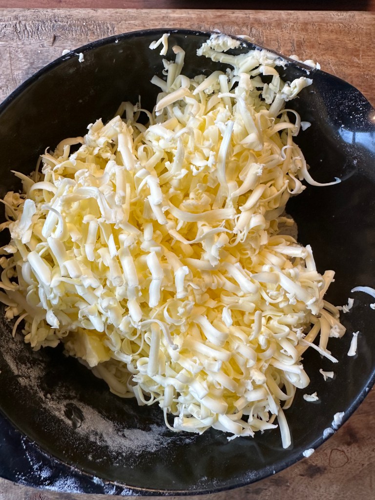 Bland først de tørre ingredienser sammen i en skål. Riv herefter smør (ligesom revet ost) og saml dejen.