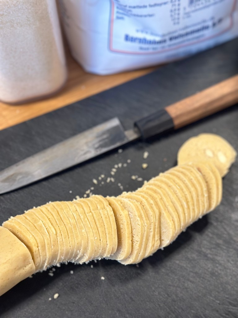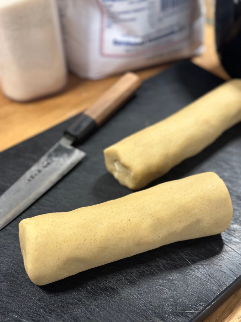 Lav en lang pølse som har den omfang som du ønsker kagerne skal have. Læg dejen på køl i mindst en time.