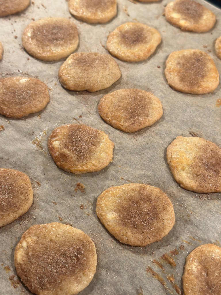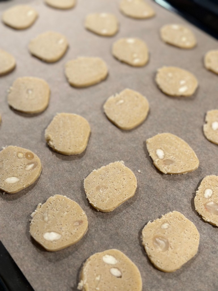 Bages i ca. 5 min varmluft ved 200 grader – tag bage papiret af og lad dem køle på en bagerist.
