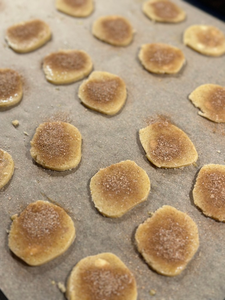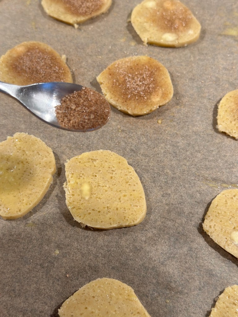 Herefter skærer du kagerne i tynde skiver – måske 0,3 cm. Læg kagerne på en bageplade og pensel med æg. Drys med kanelsukker (2 spsk rørsukker til 1 tsk stødt kanel)